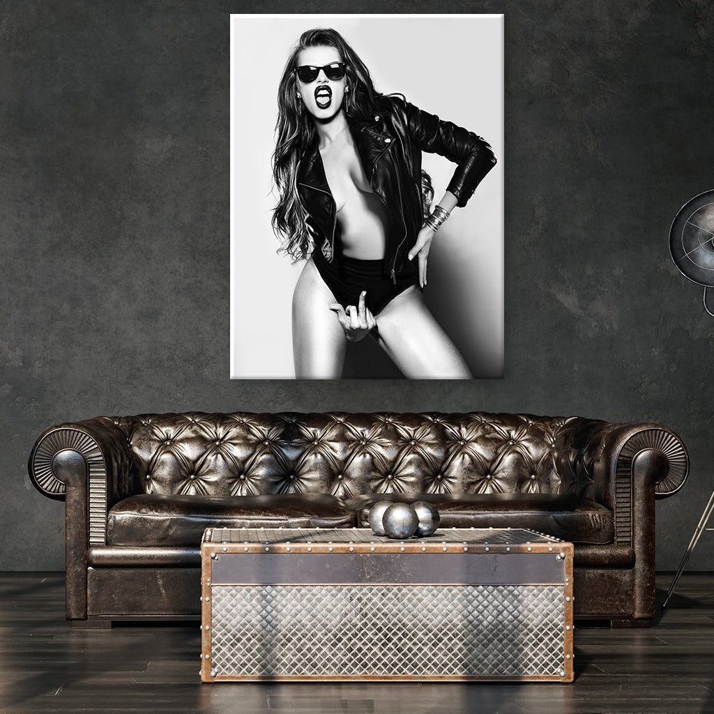 Wie wäre es mit unserer knapp bekleideten Dame mit ihrem aussagekräftigen Statement? Sie ist auf jeden Fall ein Blickfang für deine Wände im Wohnzimmer, Flur oder Schlafzimmer.
