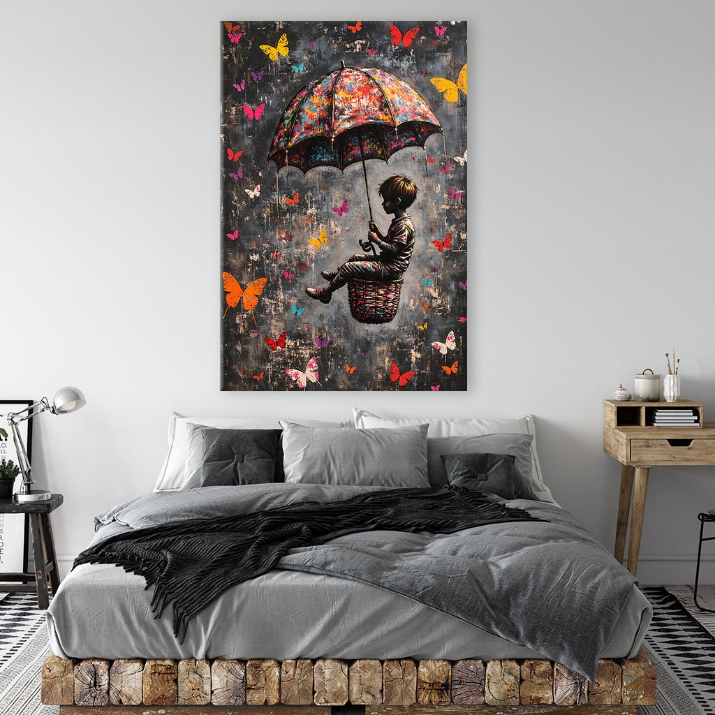 Dieses surreale Bild zeigt einen Jungen, der in einem Korb sitzend mit einem Regenschirm in der Hand durch die Nacht fliegt. Die dunkle Farbpalette wird durch leuchtende Farbflecken auf dem Regenschirm aufgebrochen, die einen spielerischen Kontrast zur düsteren Atmosphäre bilden. Im Hintergrund sind Graffiti-Elemente wie Schmetterlinge zu erkennen, die dem Bild einen Hauch von urbaner Kunst verleihen.