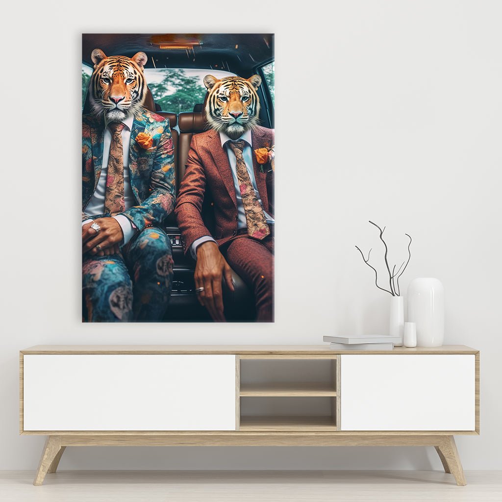 Unser außergewöhnliches Bild zeigt zwei Tiger in menschlich wirkenden Posen, beide in schicken Anzügen und sitzen in einem Auto mit luxuriösen Ledersitzen. Einer trägt einen schlichten roten Anzug, während der andere in einem bunt, geblümten Anzug gekleidet ist. Das Bild strahlt eine Mischung aus Eleganz und Humor aus, die jeden Betrachter fasziniert.