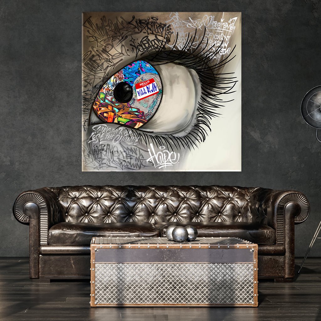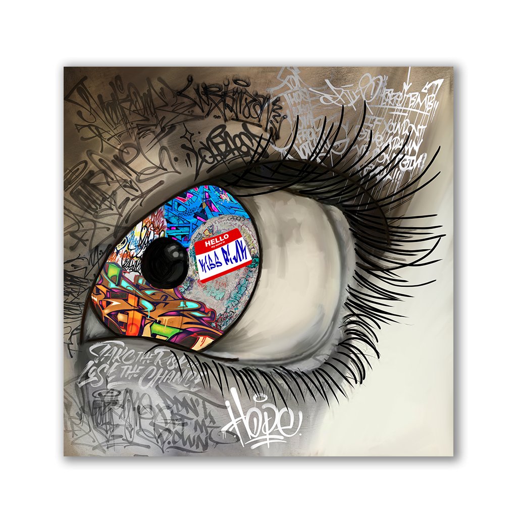 Ein faszinierendes Kunstwerk im Stil des Graffiti zeigt das Auge als Mittelpunkt. Die Iris, kunstvoll gestaltet im Streetart-Stil, vermittelt die Sichtweise eines Grafikers auf die Welt. Es symbolisiert die Art und Weise, wie ein Künstler seine Umgebung einfängt und interpretiert. Die bunten Elemente und die dynamische Gestaltung spiegeln die Kreativität und Vielfalt wider, die in der Welt der Kunst vorhanden sind.