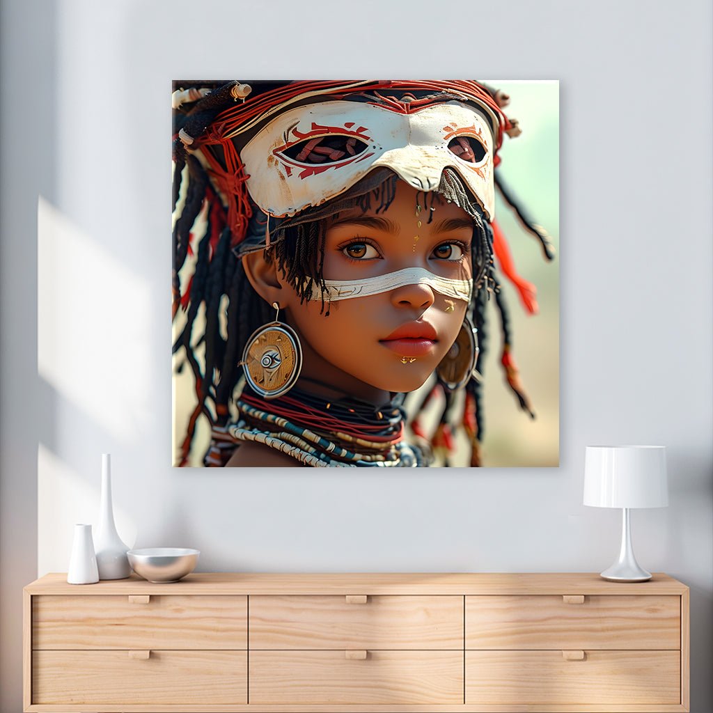 Das Bild zeigt eine Nahaufnahme eines jungen Mädchens mit dunklen Haaren und großen, braunen Augen. Sie trägt eine weiße Maske mit roten Akzenten, die ihre Stirn bedeckt und ein Teil ihres Gesichts verdeckt. Ihr Haar ist zu Zöpfen geflochten, die mit roten und weißen Fäden verziert sind. Sie trägt große, runde Ohrringe und mehrere Halsketten mit Perlen und anderen Verzierungen. Im Hintergrund ist eine verschwommene, helle Landschaft zu sehen. Das Bild hat einen verträumten und leicht surrealen Charakter.