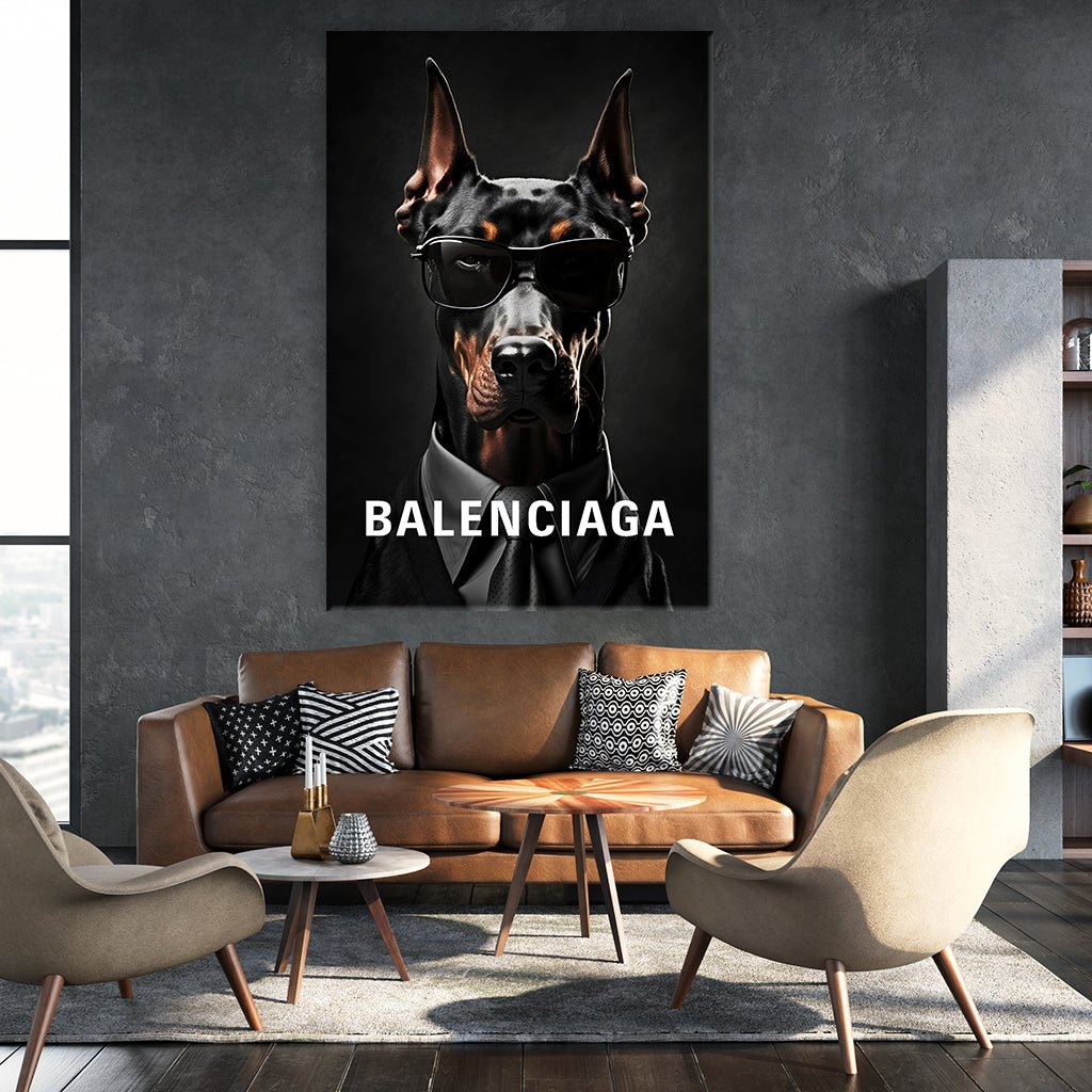 Ein eindrucksvolles Bild präsentiert den Nahaufnahme-Kopf eines Dobermanns in einem eleganten Anzug und cooler Sonnenbrille. Dieser stilvolle Hund posiert vor einem tief schwarzen Hintergrund, während der Schriftzug "BALENCIAGA" im unteren Bildbereich für Raffinesse und Modebewusstsein steht. Ein Kunstwerk, das Eleganz und Klasse verkörpert.