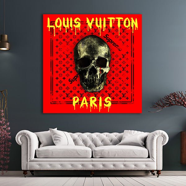 Der Künstler dieses Motivs gestaltete ein außergewöhnliches Motiv mit einem Totenkopf in Gold. Auf dem roten Hintergrund sind die Logos der Luxusmarken Louis Vuitton und Supreme in schwarz im Grungestil zu sehen. Es passt perfekt in dein modern eingerichtetes Wohnzimmer, Schlafzimmer, Büro oder auch deinen Flur.