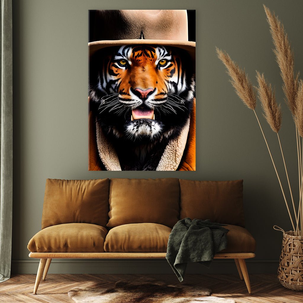 Dieses eindrucksvolle Porträt zeigt einen majestätischen Tiger, der einen Rancherhut und eine warme gefütterte Jacke trägt. Dieses beeindruckende Kunstwerk fängt die wilde Schönheit und die rätselhafte Aura dieses majestätischen Tieres ein, während es gleichzeitig eine Prise von Abenteuer und Stil vermittelt.