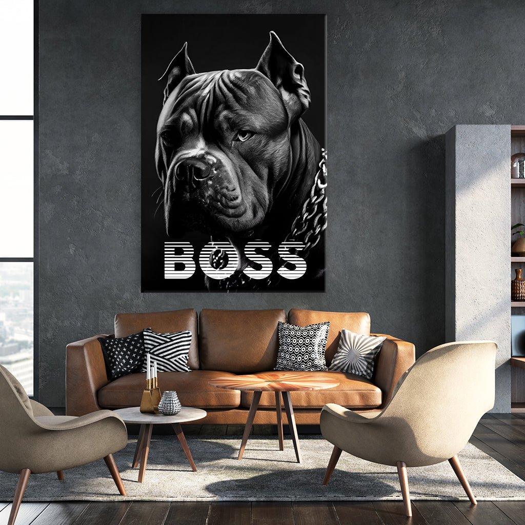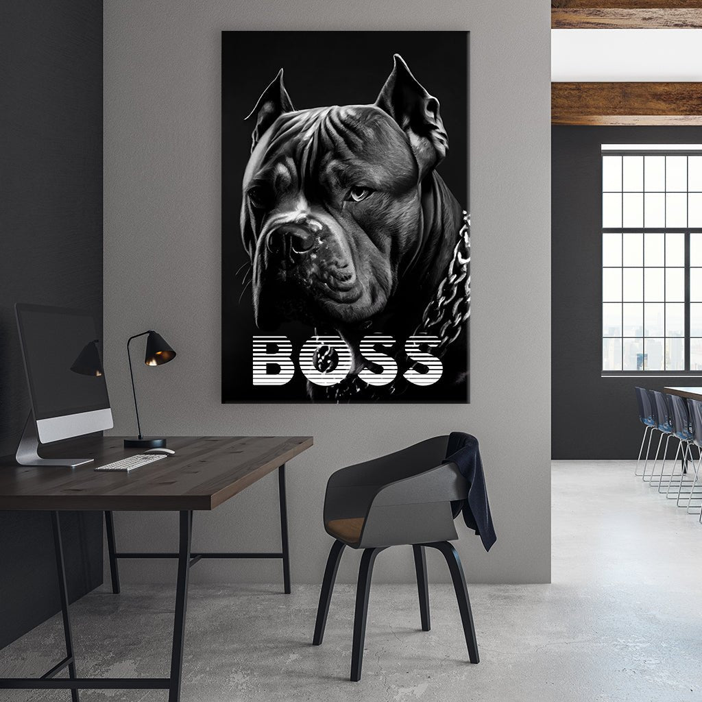 Ein markantes Schwarz-Weiß-Porträt eines unerschrockenen kräftigen Pitbulls vor dunklem Hintergrund. Im unteren Bereich des Bildes prangt der Schriftzug "BOSS", der die kraftvolle Präsenz dieses furchtlosen Hundes unterstreicht. Ein beeindruckendes Kunstwerk, das Stärke und Eleganz vereint.