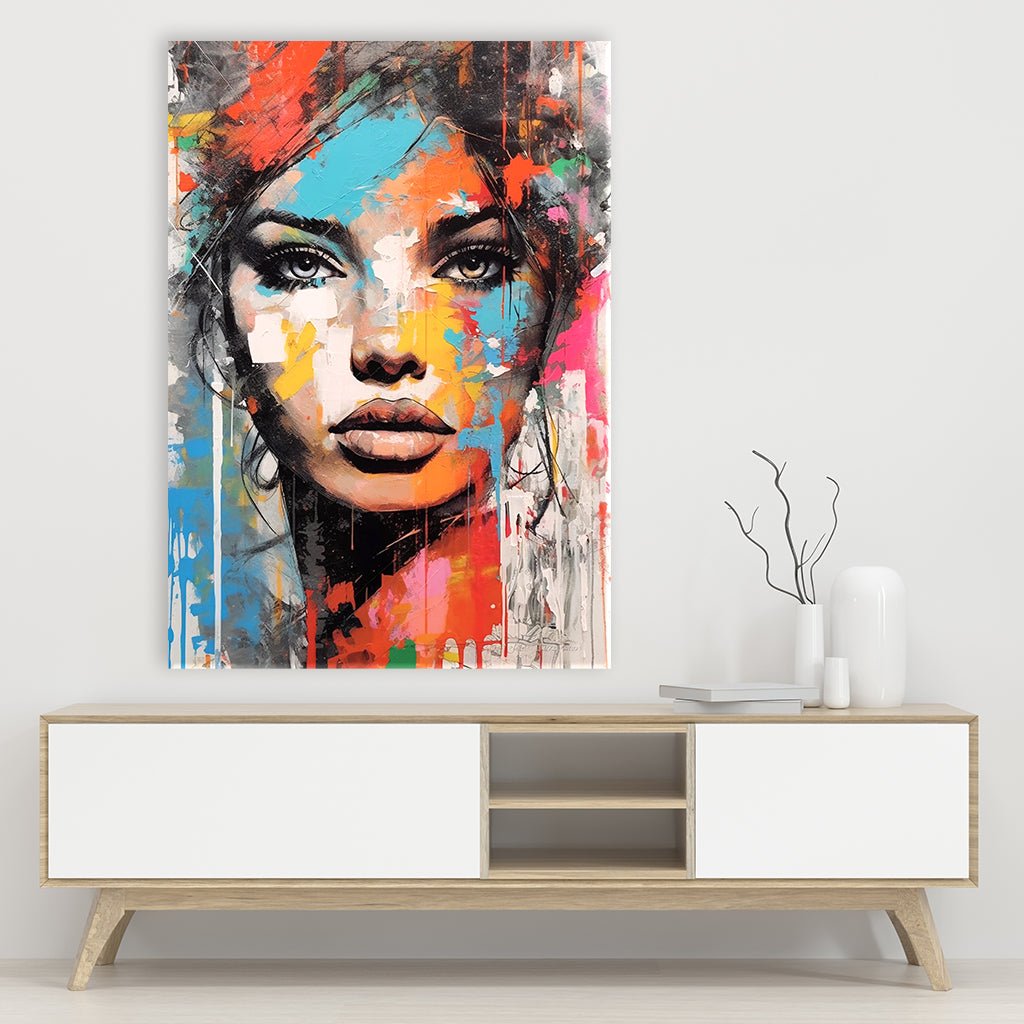 Eine Frau im Streetart-Stil zieht alle Blicke auf sich, während sie dich mit ihren eindrucksvollen Augen direkt ansieht. Die künstlerische Darstellung fängt die Intensität ihres Blickes ein und verleiht dem Bild eine faszinierende Ausdruckskraft. Die Streetart-Ästhetik verleiht der Frau eine moderne und urbane Note, die den Betrachter in ihren Bann zieht.