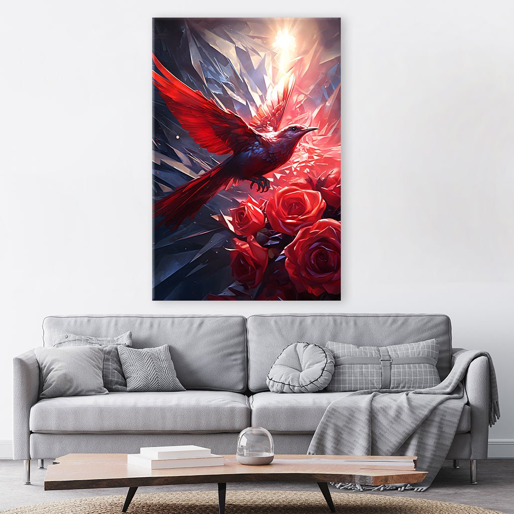 Ein roter Vogel schwebt elegant durch die Lüfte, während rote Rosen im Vordergrund blühen. Die Sonne bahnt sich ihren Weg durch die eisigen Gipfel der Berge und taucht die Szenerie in ein warmes Glühen. Dieses Bild fängt die Kontraste der Natur ein - die Leichtigkeit des Vogels und der Blumen im Kontrast zur majestätischen Kälte der Eisberge. Eine wunderschöne Verschmelzung von Farben und Elementen.