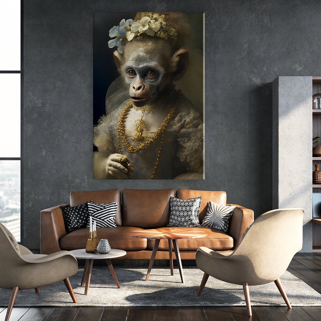 Das Blumenmädchen-Äffchen trägt ein prächtiges Rokokokleid, das mit filigranen Blumenmustern verziert ist. In ihrem lockigen Haar schmückt sie sich mit einem Haarreif aus duftenden Blumen und trägt goldene Ketten um ihren zierlichen Hals.