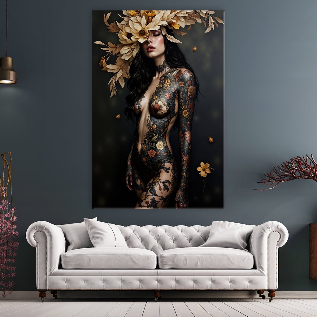 Dieses fesselnde Bild zeigt eine Frau von vorne, deren Körper mit einem üppigen, dunklen Blumenmeer tätowiert ist. Eine Vielzahl von Blumen bedeckt ihre Haut und bildet ein lebendiges Muster. Ihr Kopf ist mit einem noch opulenten Kopfschmuck aus gelblichen Blumen geschmückt. Der dunkle Hintergrund lässt die Blumen und die Haut der Frau noch mehr hervorstechen und verleiht dem Bild eine geheimnisvolle und dramatische Atmosphäre.