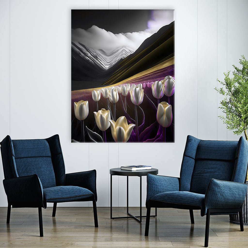 Dieses surreale Bild zeigt ein Feld mit weißen Tulpen im Vordergrund, die in einer kontrastreichen Landschaft stehen. Die Tulpen sind detailreich dargestellt und strahlen ein sanftes Licht aus. Im Hintergrund erheben sich dunkle Berge unter einem dramatischen Himmel mit weißen Wolken. Die Farben des Bildes sind gedämpft und spielen mit Kontrasten, um eine mysteriöse und zugleich ruhige Atmosphäre zu schaffen.