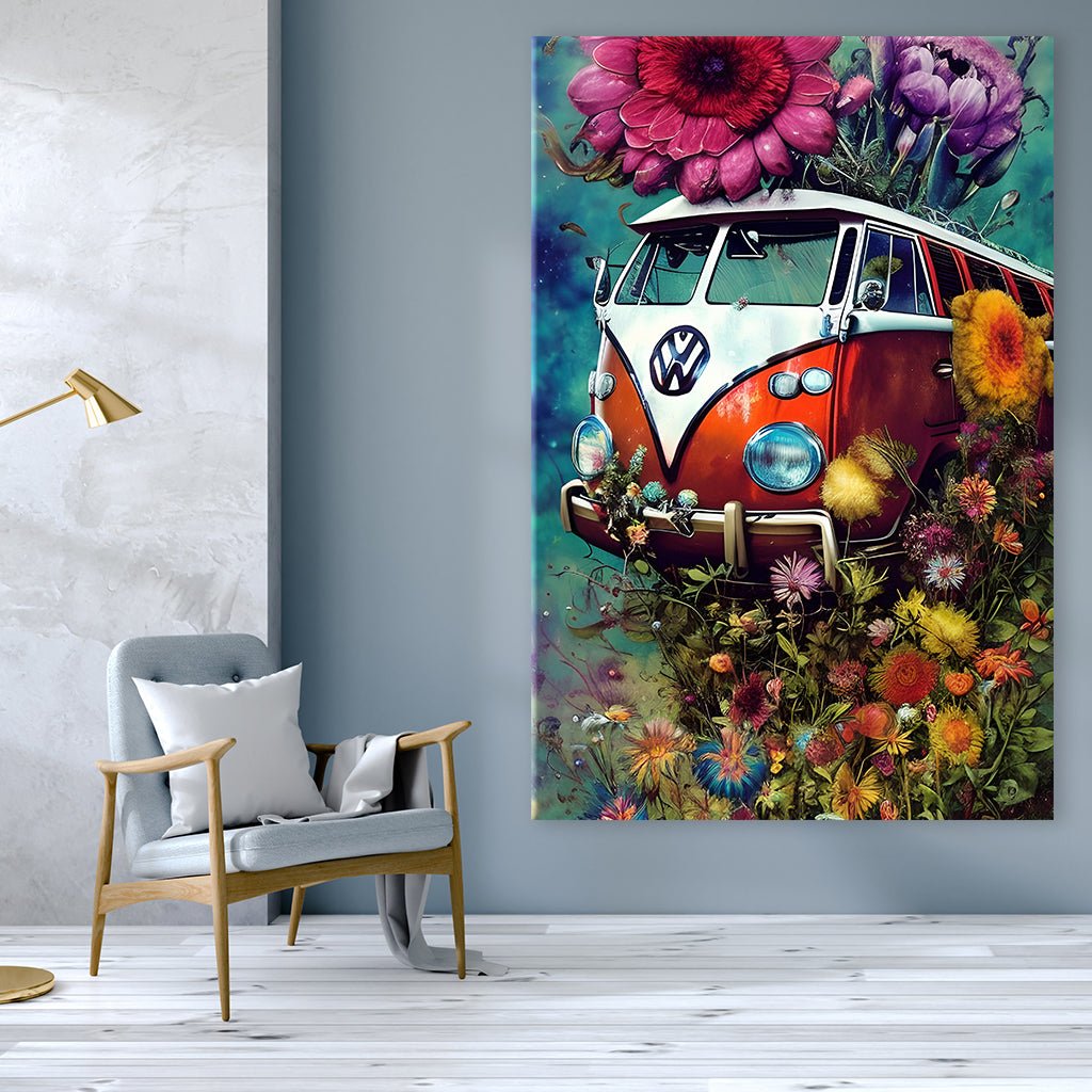 Bei diesem Motiv steht ein klassischer Bully im Mittelpunkt, der aus einer Fülle von Blumen hervor fährt. Das Fahrzeug strahlt in den charakteristischen Rot-Weiß-Tönen und vermittelt ein nostalgisches Gefühl vergangener Zeiten. Die Blumenpracht um den Bully herum ist atemberaubend. Eine Fülle von bunten Blüten wie Gerbera, Wildblumen und anderen farbenfrohen Gewächsen schmücken die Szenerie.