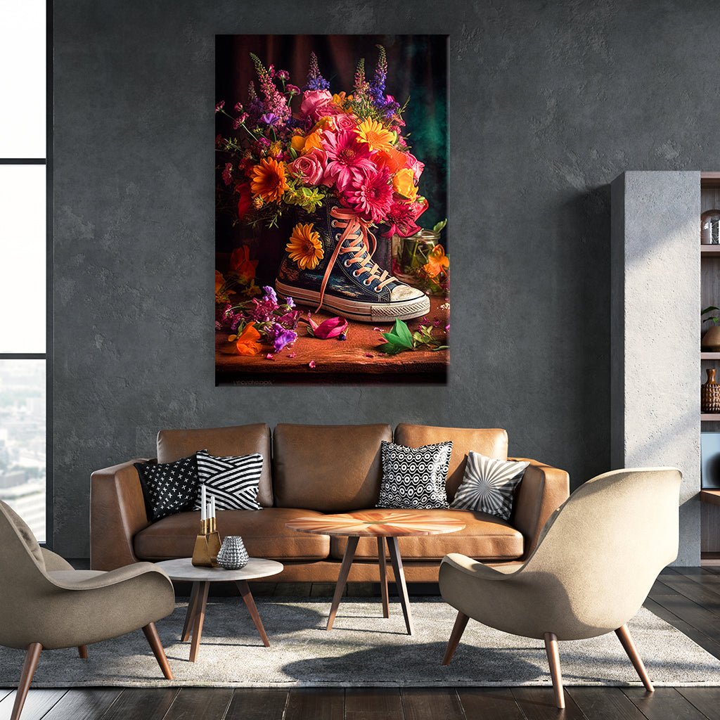 Ein beliebter Schuh, gestaltet im trendigen Jeanslook, wird auf kreative Weise mit einem üppigen Strauß Blumen kombiniert. In dem Schuh befinden sich Rosen und Gerbera in den Farben Orange, Rosa und Lila. Dieses Motiv ist von einem warmen Licht umgeben und strahlt eine einladende Atmosphäre aus, ideal für eine einzigartige und lebhafte Wohnraumgestaltung.