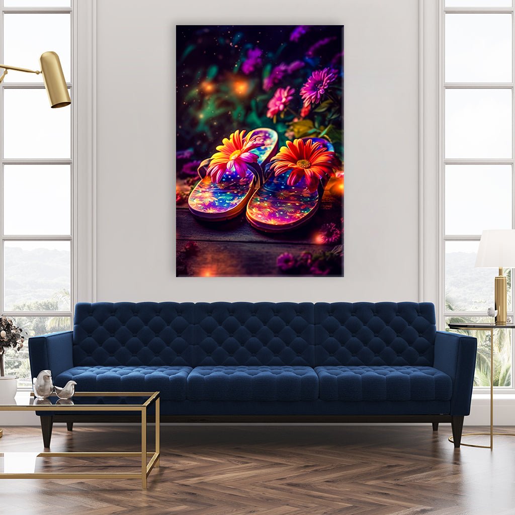 Bunte Flip Flops, die an einen karibischen Sommernachtstraum erinnern, sind in einem magischen Funkeln eingefangen. Eine große Blüte ziert jeweils die Riemchen und verleiht diesem Schuhwerk einen besondere Schönheit. Ein perfektes Motiv, um das Gefühl eines unvergesslichen Urlaubs einzufangen und ein Stück Karibik in den Alltag zu bringen. Geeignet für frische und lebhafte Raumgestaltungen.