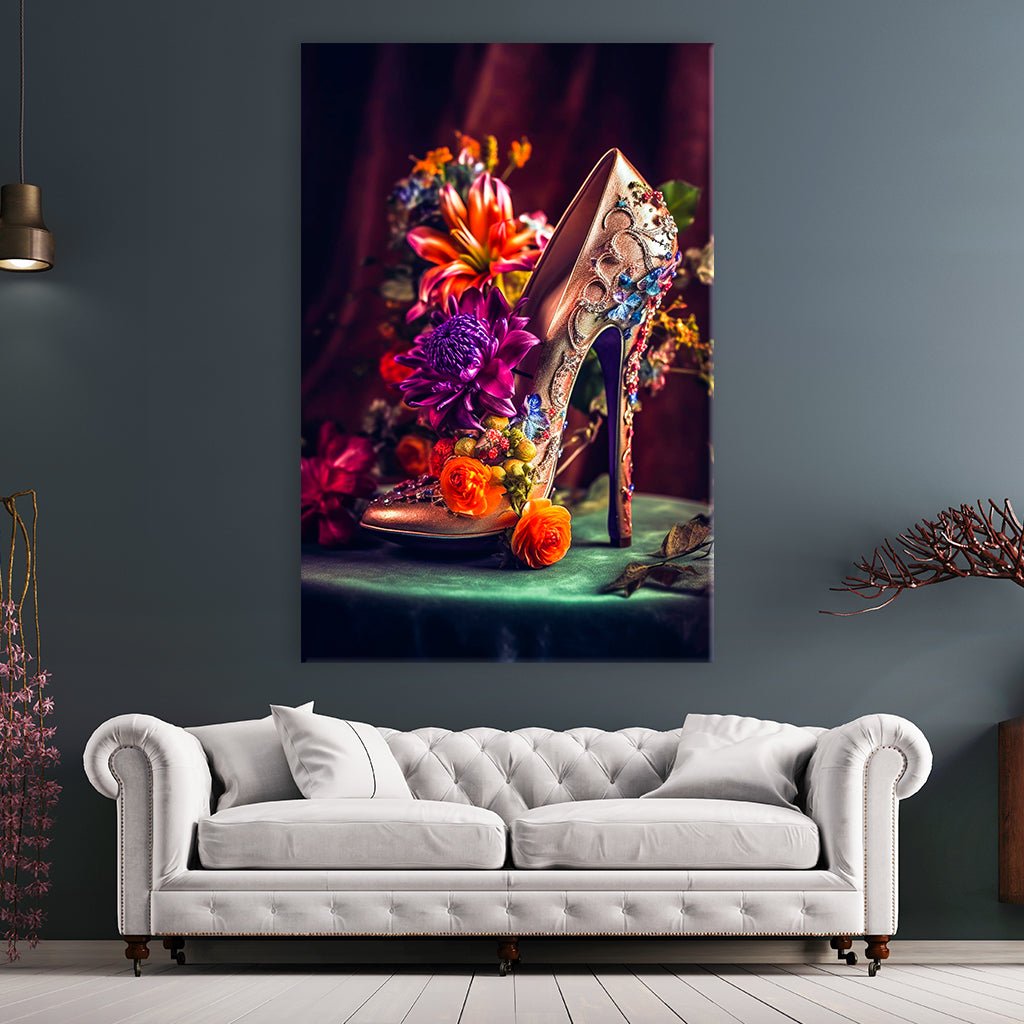 Talons hauts, style fleuri ! Avec le motif "Flowery High Heels" de Himmelmiez, vous aurez une décoration murale unique. Le talon haut doré, orné de détails délicats et de magnifiques fleurs, attirera tous les regards !