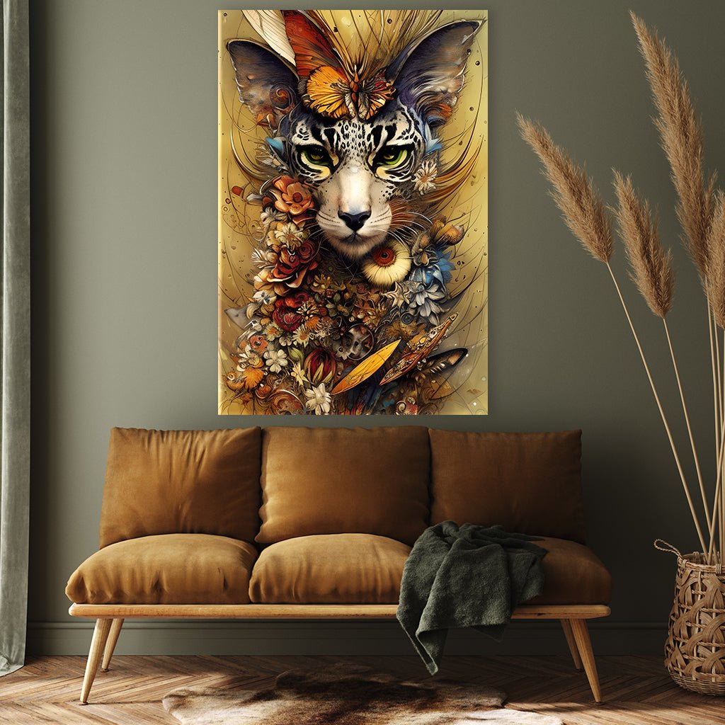 In dieser außergewöhnlichen Szene entdecken wir eine Fantasie-Wildkatze, die von einer üppigen Blumenpracht umgeben ist. Die Kombination aus der wilden Natur der Katze und der Vielfalt der Blumen erzeugt eine harmonische Balance zwischen Kraft und Anmut. Die Szene ist eine Hommage an die Kreativität und Schönheit der Natur, und erinnert uns daran, wie kostbar und einzigartig unsere Welt ist.