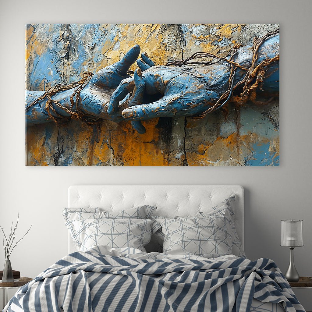 Dieses fesselnde Bild fängt einen Moment der Verbindung und Intimität ein. Zwei Hände, in einem tiefen Blauton gehalten und von einer rauen, texturierten Oberfläche überzogen, greifen auf zarte Weise ineinander. Die Hände sind von verflochtenen, drahtähnlichen Ranken umgeben, die ein Gefühl von Zerbrechlichkeit und Verletzlichkeit vermitteln. Die gedämpfte Farbpalette aus Blau-, Grau- und Goldtönen schafft eine stimmungsvolle und nachdenkliche Atmosphäre.