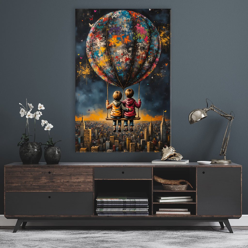 Dieses verträumte Bild zeigt einen Jungen und ein Mädchen, die auf einer Schaukel sitzend an einem Heißluftballon über die Dächer einer nächtlichen Stadt schweben. Die dunkle Farbpalette wird durch leuchtende Graffiti-Elemente aufgebrochen, die den Ballon und die Stadt schmücken. Die Szene wirkt wie ein urbaner Traum, in dem die Kinder der Realität entfliehen und in den Nachthimmel aufsteigen.