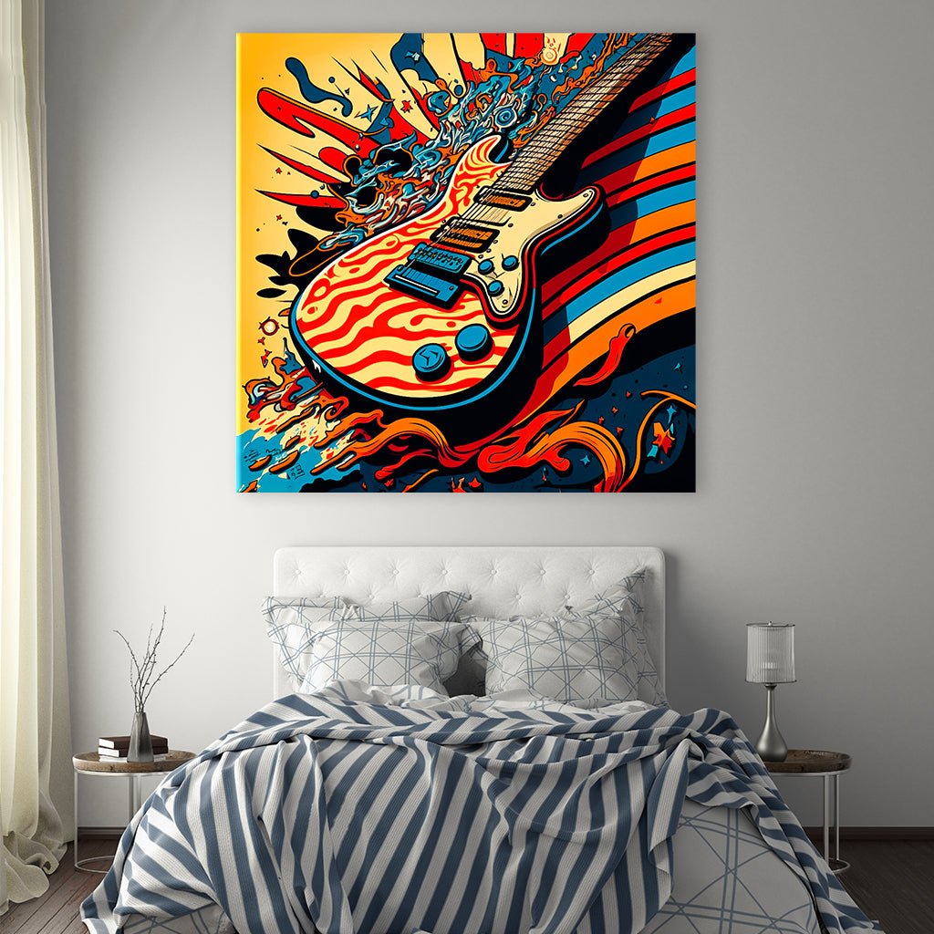 Das Motiv zeigt eine Gitarre, die auf einzigartige und funky Weise im Pop-Art-Comic-Stil dargestellt ist. Die Gitarre ist mit kräftigen und lebendigen Farben gestaltet, die sofort ins Auge springen. Jeder Farbton scheint sich lebendig zu entfalten und verleiht der Gitarre eine dynamische und energetische Ausstrahlung. Das Pop-Art-Element zeigt sich in den klaren Linien, den leuchtenden Farbblöcken und den starken Kontrasten. Die Gitarre wird zu einem lebendigen und spielerischen Symbol für Musik und Kreativität.