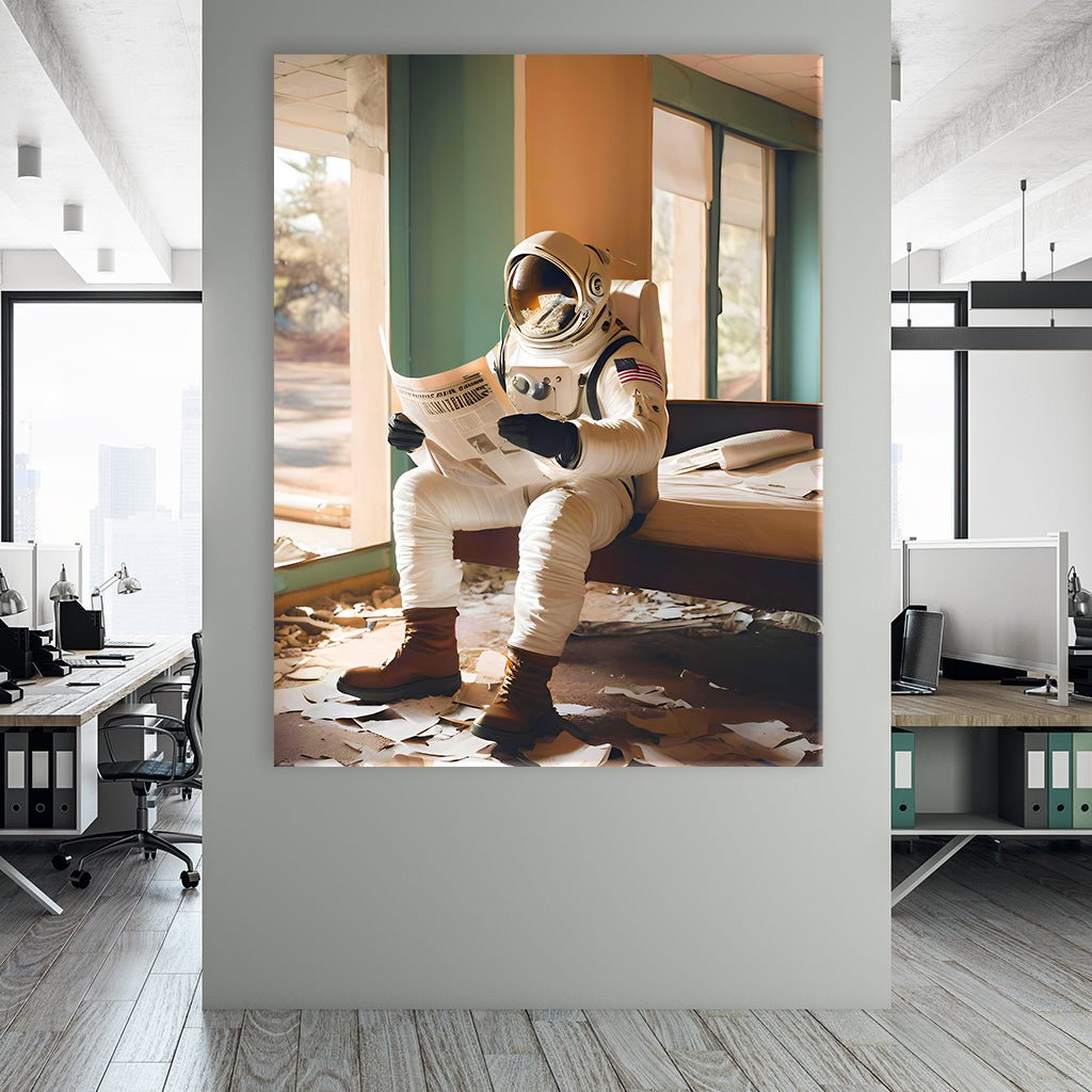 Un astronaute est assis au bord du lit d'une maison apparemment abandonnée, absorbé par la lecture d'un journal. De vieux restes de papier peint et de tapisserie jonchent le sol. La scène est baignée de douces teintes de vert et de beige, conférant à l'image une atmosphère calme et mélancolique. Le contraste entre l'astronaute moderne et l'environnement délabré crée un motif fascinant et contemplatif.