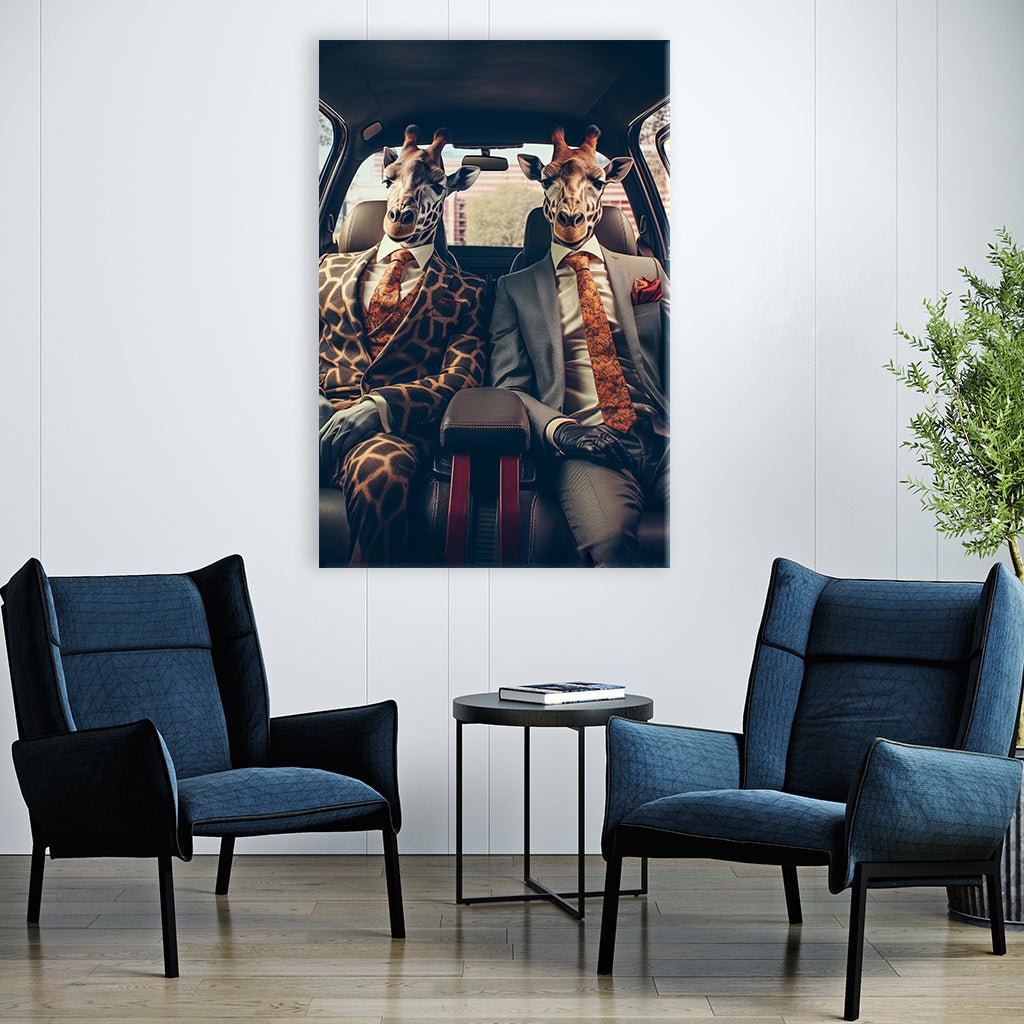Unser außergewöhnliches Bild zeigt zwei Giraffen in menschlichen Posen, beide in schicken Anzügen in einem Businessauto sitzend. Einer trägt einen schlichten grauen Anzug, während der andere in einen Anzug mit Giraffenmuster gekleidet ist. Das Bild strahlt eine Mischung aus Erfolg und Humor aus, die jeden Betrachter fasziniert.