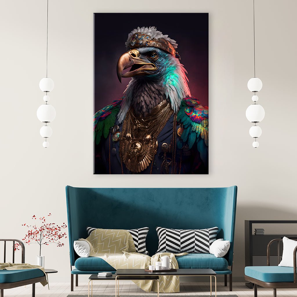 Der majestätische Adler trägt stolz seinen goldenen Schnabel und ist mit einer Vielzahl von goldenen Halsketten und einem großen Collier geschmückt. Ein farbenfroher Umhang mit bunten Federn umhüllt seinen majestätischen Körper.
