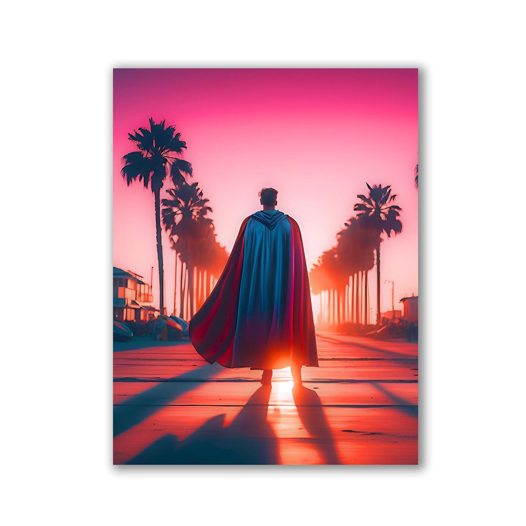 Ein Superheld schreitet dem Sonnenaufgang entgegen, seine Silhouette kraftvoll und entschlossen gegen die beeindruckende Kulisse des frühen Morgens. Am Wegesrand reihen sich elegante Palmen im sanften Licht der aufgehenden Sonne. Der Himmel ist in ein spektakuläres Farbenspiel aus Pink und Rot getaucht, das sanft in einen warmen Farbverlauf übergeht und die Szene in ein faszinierendes, energetisches Licht hüllt.