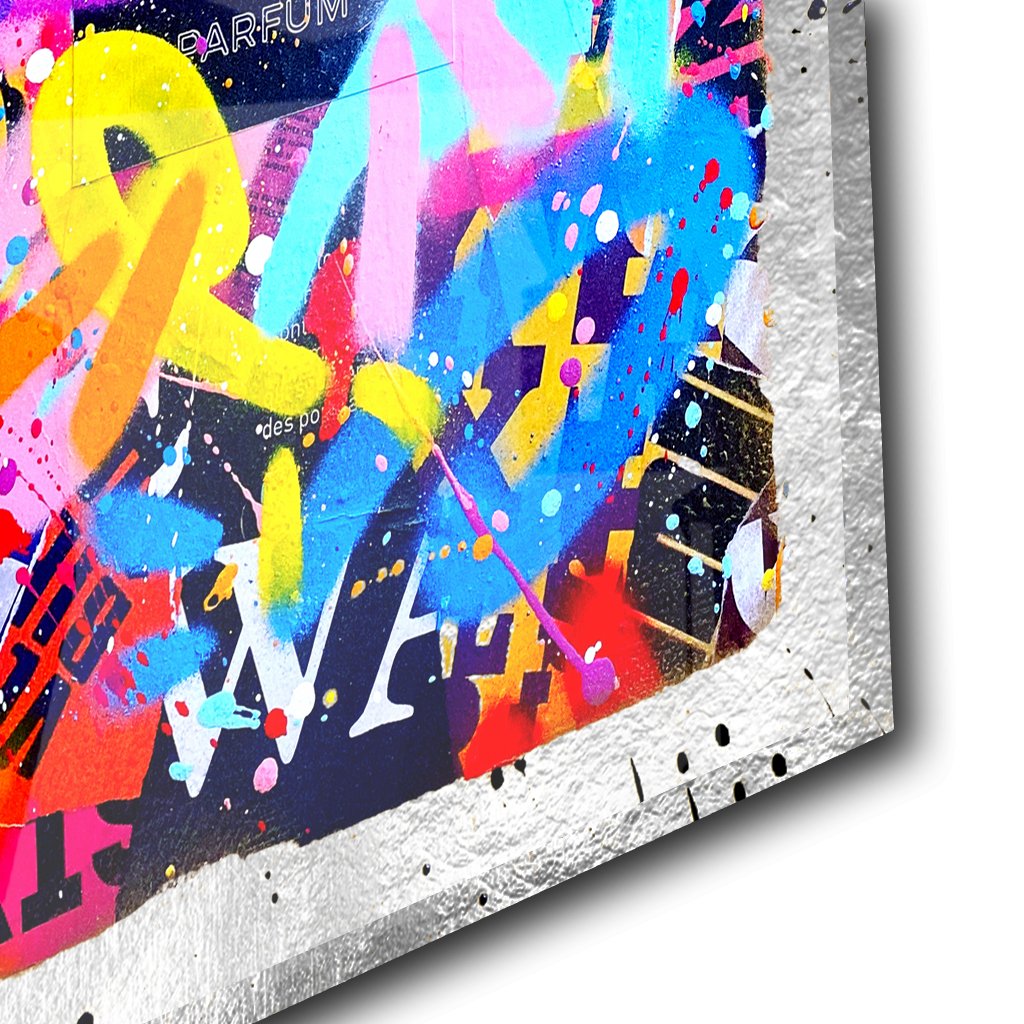 Das Motiv der Chanel Flasche, das mit bunten Graffitis besprüht ist, ist eine moderne Interpretation des klassischen Luxusprodukts. Es zeigt die Verbindung zwischen der Welt der High Fashion und der Straßenkunst. Das Blattsilber im Hintergrund verleiht dem Motiv eine besondere Wertigkeit und verstärkt die Botschaft des Künstlers.