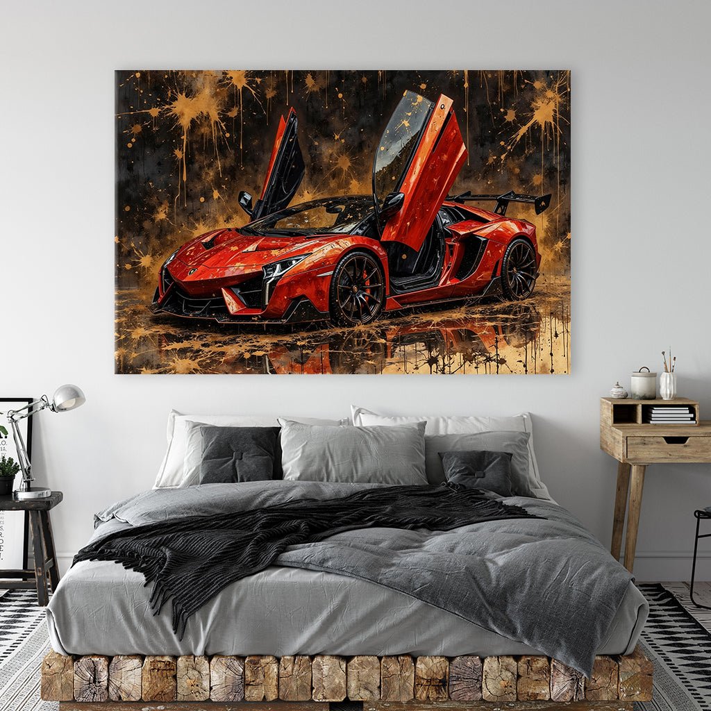 Dieses Bild zeigt einen roten Sportwagen, der an einen Lamborghini erinner, vor einem Hintergrund, der wie eine goldene Explosion aus Farbe und Licht wirkt. Der Stil ist dynamisch und energiegeladen, was die Kraft des Autos betont.