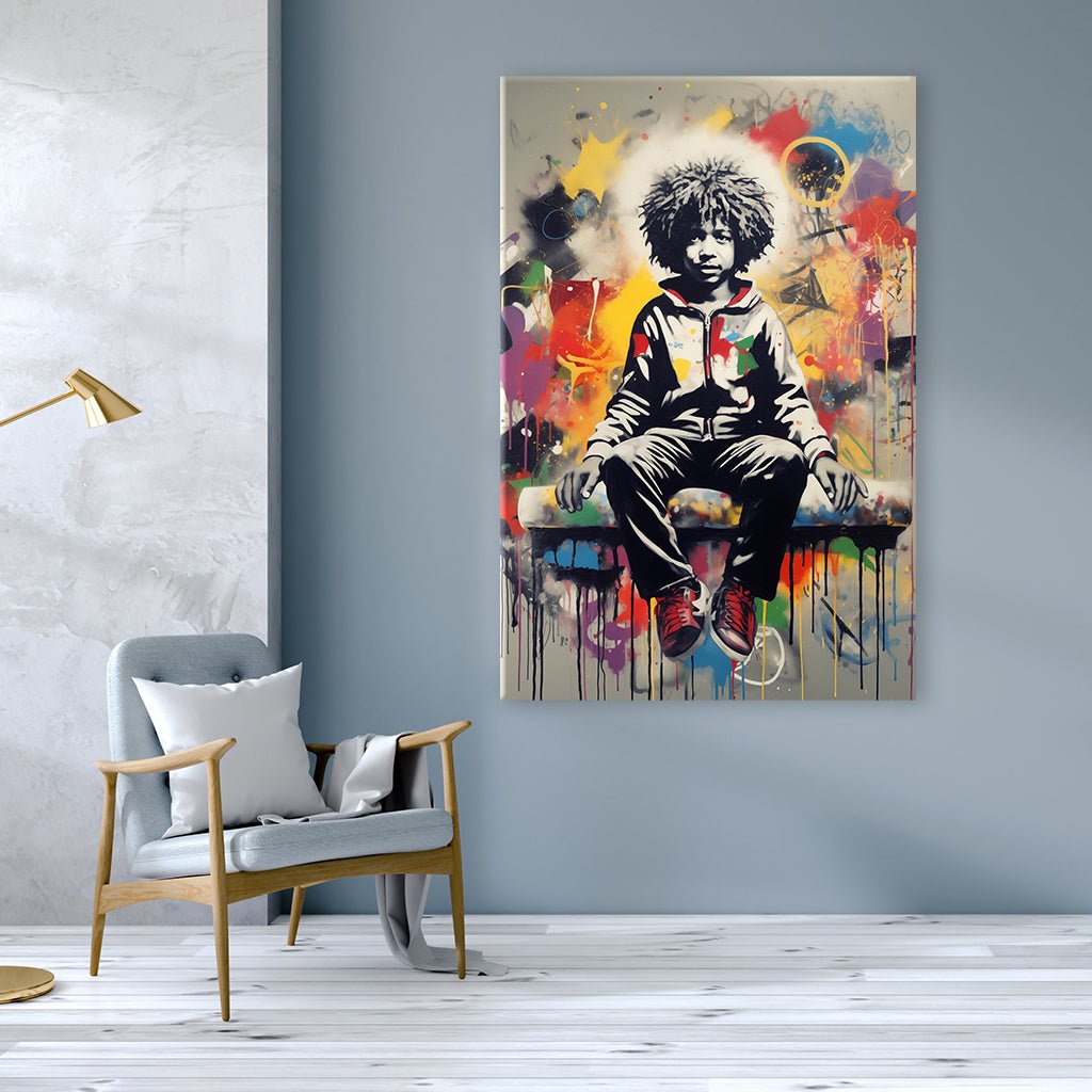Dieses Banksy-inspirierte Bild im Graffitistil zeigt einen Jungen mit einer lockigen Afrofrisur, der lässig auf einem Mauerstück sitzt. Die verlaufene Farbgebung verstärkt den Streetart-Charakter und verleiht dem Bild eine gewisse Unmittelbarkeit.