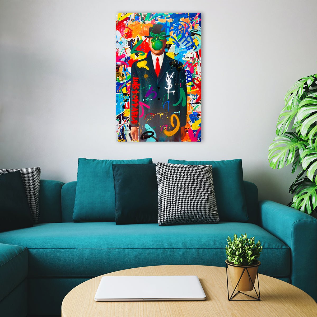 Unser Motiv zeigt eines der bekanntesten Motive des Künstlers René Magritte, dessen Bilder mit dem Denken und der Wahrnehmungsfähigkeit des Betrachters spielt. Abstrakt umgestaltet mit bunten Farben und Graffiti ist ein neuer farbenfroher Stil entstanden und somit ein besonderer Eyecatcher in jedem Raum. Ganz egal ob an der Bilderwand im Wohnzimmer, Schlafzimmer oder Flur.