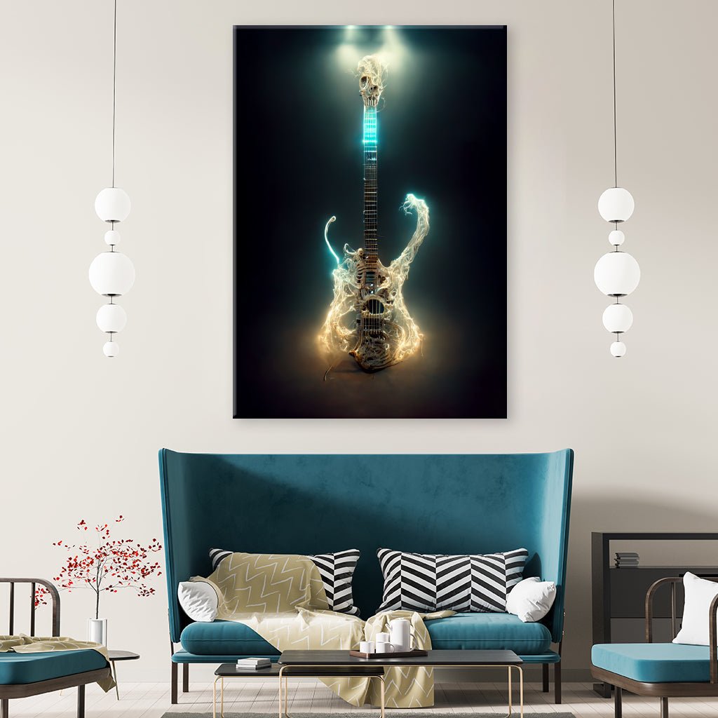 L'image représente une guitare posée sur un fond sombre. Le corps de la guitare est composé de fumée et d'effets électriques dans différentes nuances de bleu et de jaune qui se fondent les unes dans les autres. Le motif crée une atmosphère d'énergie et de passion.