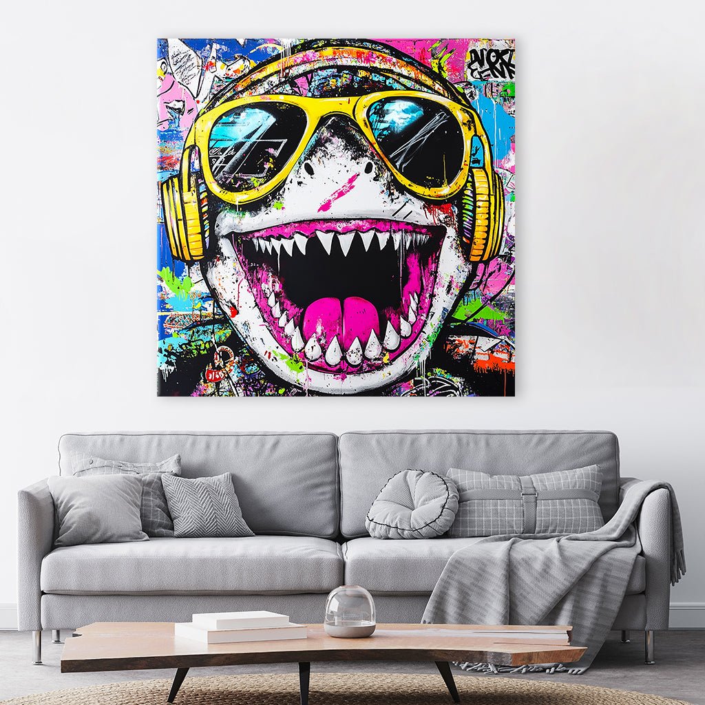 Dieses bunte und lustige Motiv schreit gerade zu nach guter Laune. Der Hai mit dem weit aufgerissenen Maul wirkt auf Grund der bunten Farbgestaltung im Graffitistil und der übergroßen gelben Sonnenbrille und den gelben Kopfhöhrern sogar sehr freundlich.