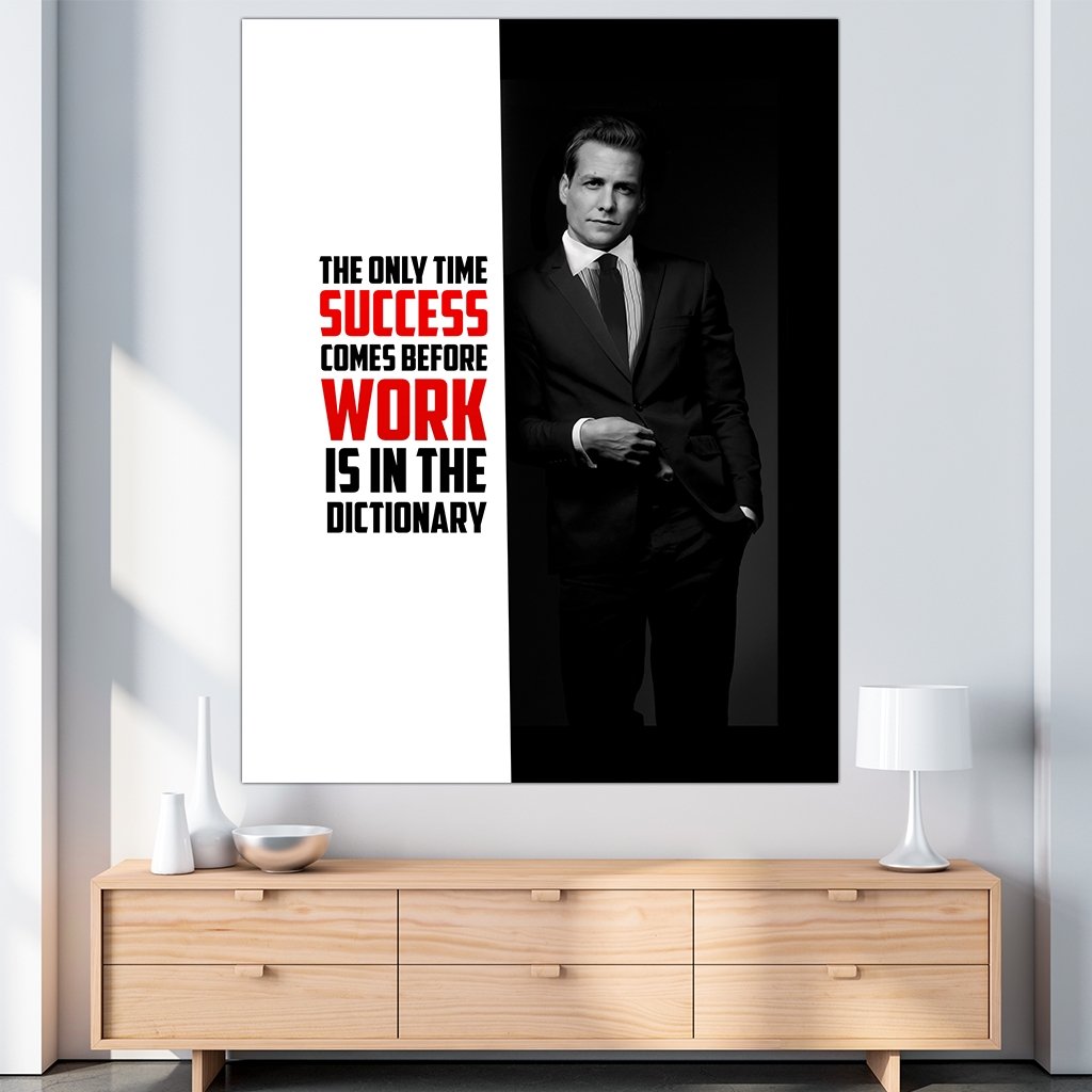 "Nur im Wörterbuch kommt der Erfolg vor der Arbeit" kannst du auf diesem Motiv mit Harvey lesen. In schwarz-weiß gehalten und die Schlagwörter in Rot hervorgehoben lassen das Bild zu einem Hingucker werden und sind die perfekte Motivation für deine Bilderwand im Wohnzimmer, Flur oder auch Büro.