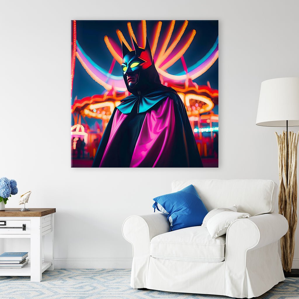 Auf einem lebhaften Jahrmarkt bei Nacht steht eine Person im Fokus des Bildes, die an den Superhelden Batman erinnert. Hinter ihr ein bunt beleuchtetes Karussell, das den Hintergrund in ein faszinierendes Lichterspiel taucht. Die Person steht mit einer düsteren Mimik und lila Cape dort, während die farbenfrohen Lichter des Karussells ihre Silhouette umrahmen und eine geheimnisvolle Atmosphäre schaffen.