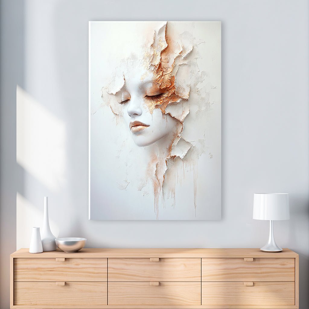 Dieses stilvolle Bild fängt die Essenz der Unschuld ein. Das Gesicht einer jungen Frau, deren Augen geschlossen sind, ist in einem weichen Weißton gehalten und von goldenen Akzenten umgeben. Die goldenen Akzente scheinen von ihrer Haut abzublättern und enthüllen die makellose Haut darunter. Das Bild hat einen verträumten und ätherischen Charakter, der ein Gefühl von Frieden und Ruhe hervorruft.
