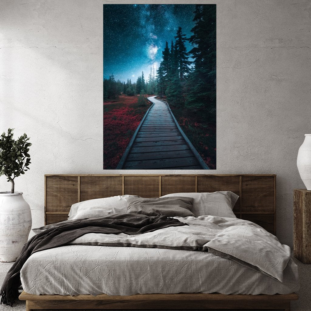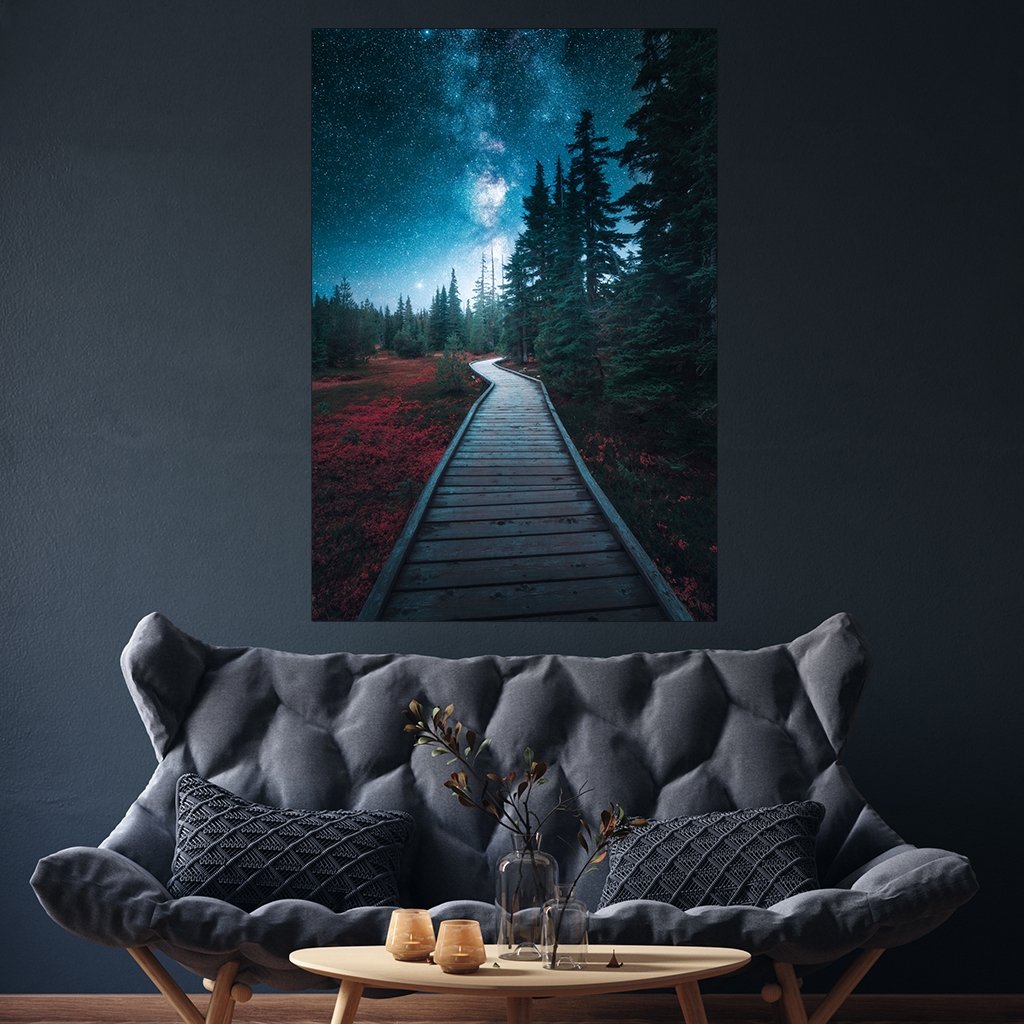 Folge dem Holzweg, auch wenn er sprichwörtlich nicht immer als der Richtige erscheint. Das Meer an Sternen weißt dir den Weg. Genieße dieses Bild und begieb dich in deinem Wohnzimmer, Schlafzimmer oder auch Flur auf die Reise.
