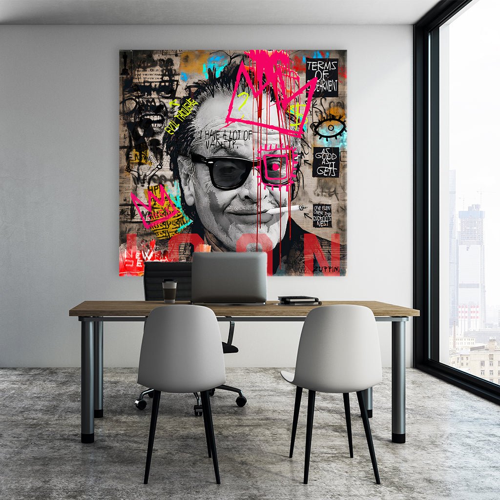 Ein schwarz-weiß Porträt von Jack Nicholson mit Sonnenbrille und Zigarette, überlagert von leuchtend pinken, gelben und türkisen Graffiti-Elementen, darunter zwei Kronen und ein Zitat: "I HAVE A LOT OF VANITY." Der Hintergrund besteht aus Collagen-Elementen und weiteren Schriftzügen, die eine rohe, urbane Ästhetik erzeugen und auf seine Filmrollen anspielen.