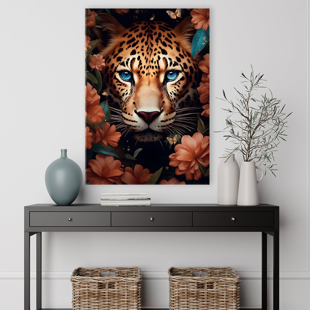 Ein majestätischer Jaguar mit strahlend blauen Augen in einer faszinierenden Farbgestaltung umgeben von Blumen. Die lebendigen Farben verleihen dem Bild eine energetische Ausstrahlung. Dieses beeindruckende Kunstwerk wird zum Blickfang in jedem Wohnzimmer, Schlafzimmer oder Flur.