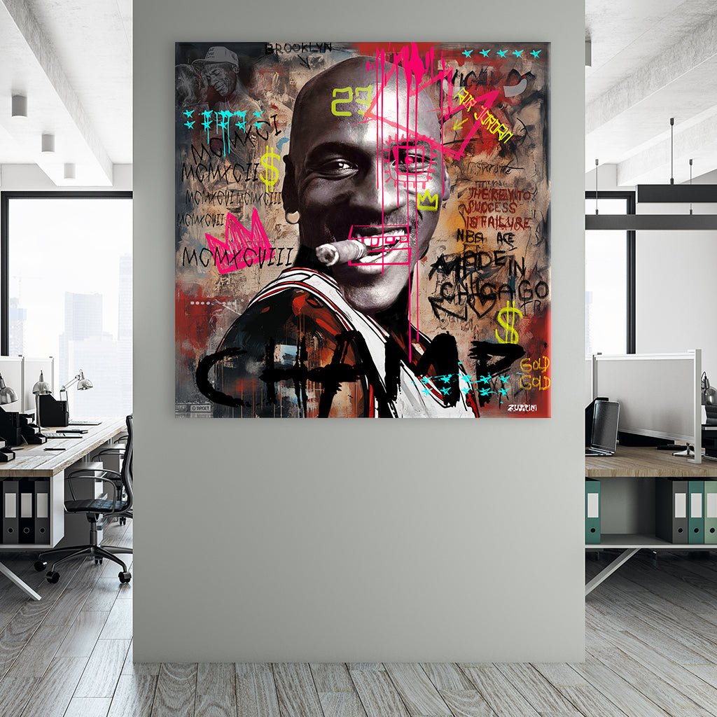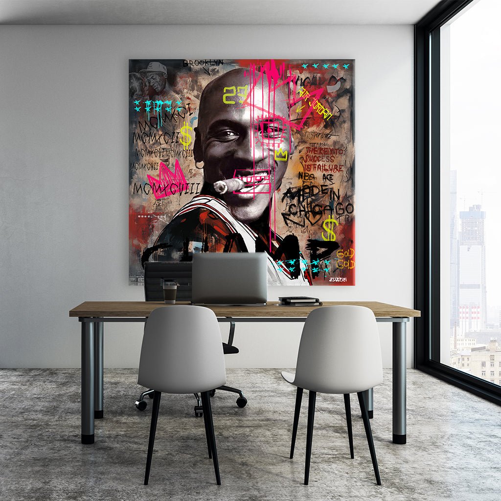 Schwarz-weiß Porträt von Michael Jordan, der eine Zigarre im Mund hat, lächelt und eine Krone trägt, die durch leuchtend pinke und gelbe Graffiti-Elemente akzentuiert wird. Zahlreiche Schriftzüge wie "BROOKLYN", "AIR JORDAN" und "MADE IN CHICAGO" sowie römische Ziffern umrahmen das Porträt, das eine Hommage an die Sportlegende und Popkultur-Ikone darstellt.