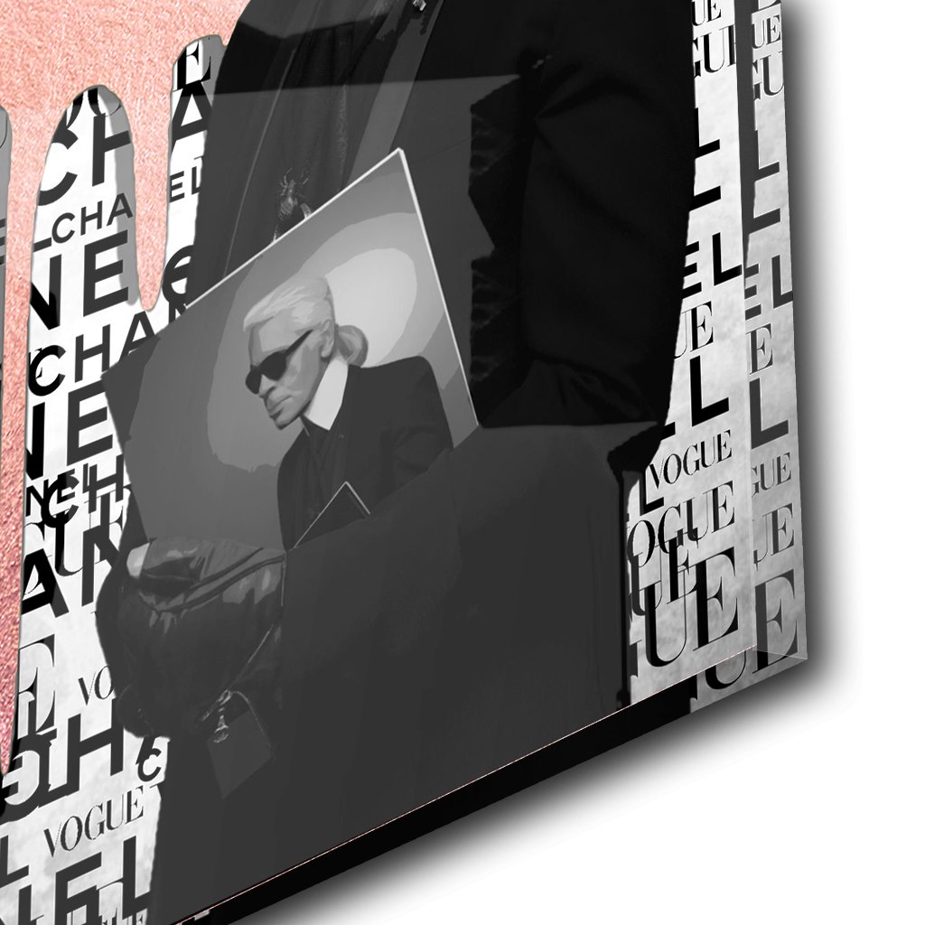 Das Bild "KARL BRAND by RS Artist Rosé auf Acryl" ist eine Hommage an den berühmten Mode-Designer Karl Lagerfeld. Im Vordergrund steht ein schwarz-weißes Porträt von Karl Lagerfeld, während im Hintergrund das Chanel-Logo in Blattsilber prangt. Das Chanel-Logo hat einen Tropf-Effekt und die Worte Chanel und Vogue wiederholen sich immer wieder in schwarzem Text. Der graue Hintergrund des Bildes gibt dem Chanel-Logo und dem Porträt von Karl Lagerfeld die perfekte Bühne.