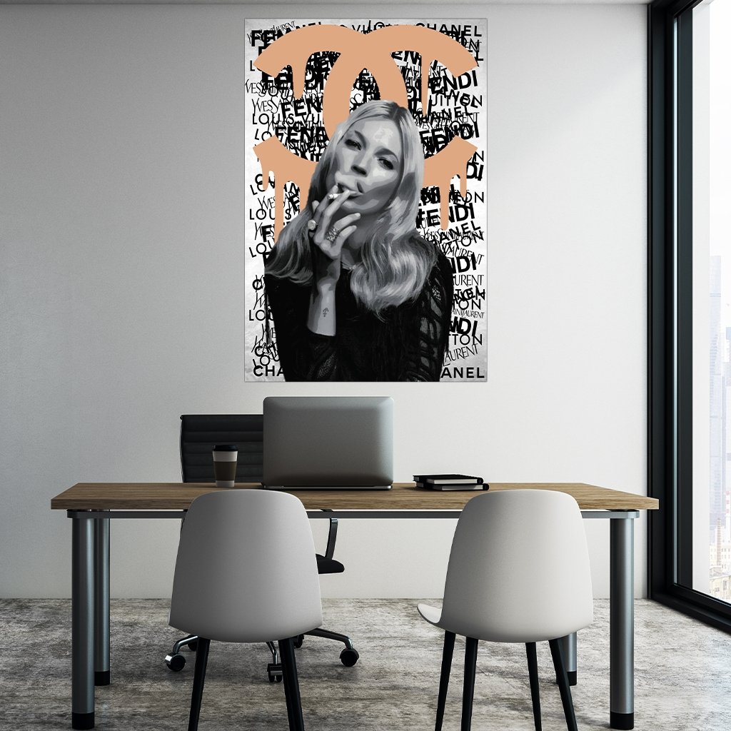 Auch als Kunstmotiv ist sie sehr beliebt wie man es an unserem Motiv mit ihr unschwer erkennen kann. Hier ist sie in Schwarz-Weiß mit einem großen Chanel-Logo abgebildet und im Hintergrund viele Namen von bekannten Luxusmarken.