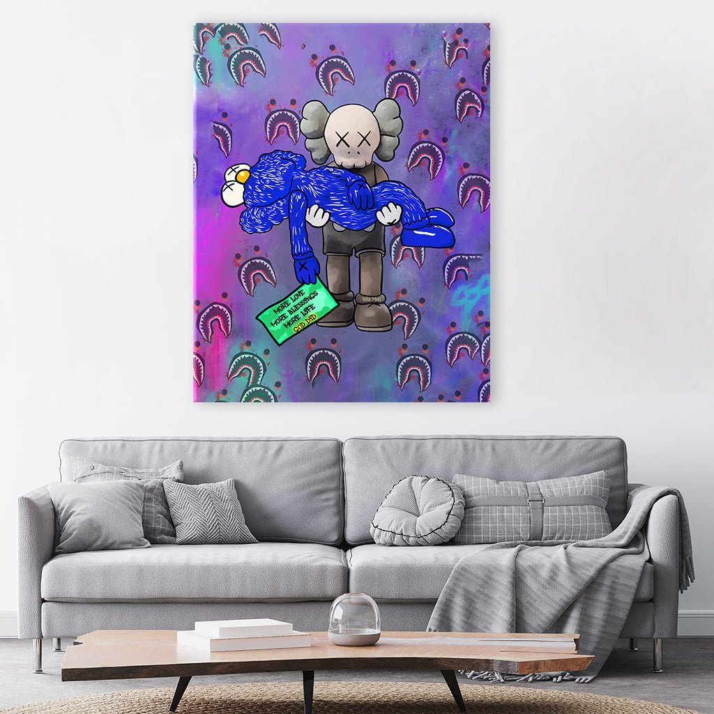 In einer herzergreifenden Szene trägt die bekannte Figur Kaws das verstorbene Krümelmonster auf seinen Armen. Diese bewegende Darstellung symbolisiert Verbundenheit und Erinnerung. Kaws, selbst eine kreative Ikone, hält in dieser besonderen Szene die geliebte Figur des Krümelmonsters in Ehren.