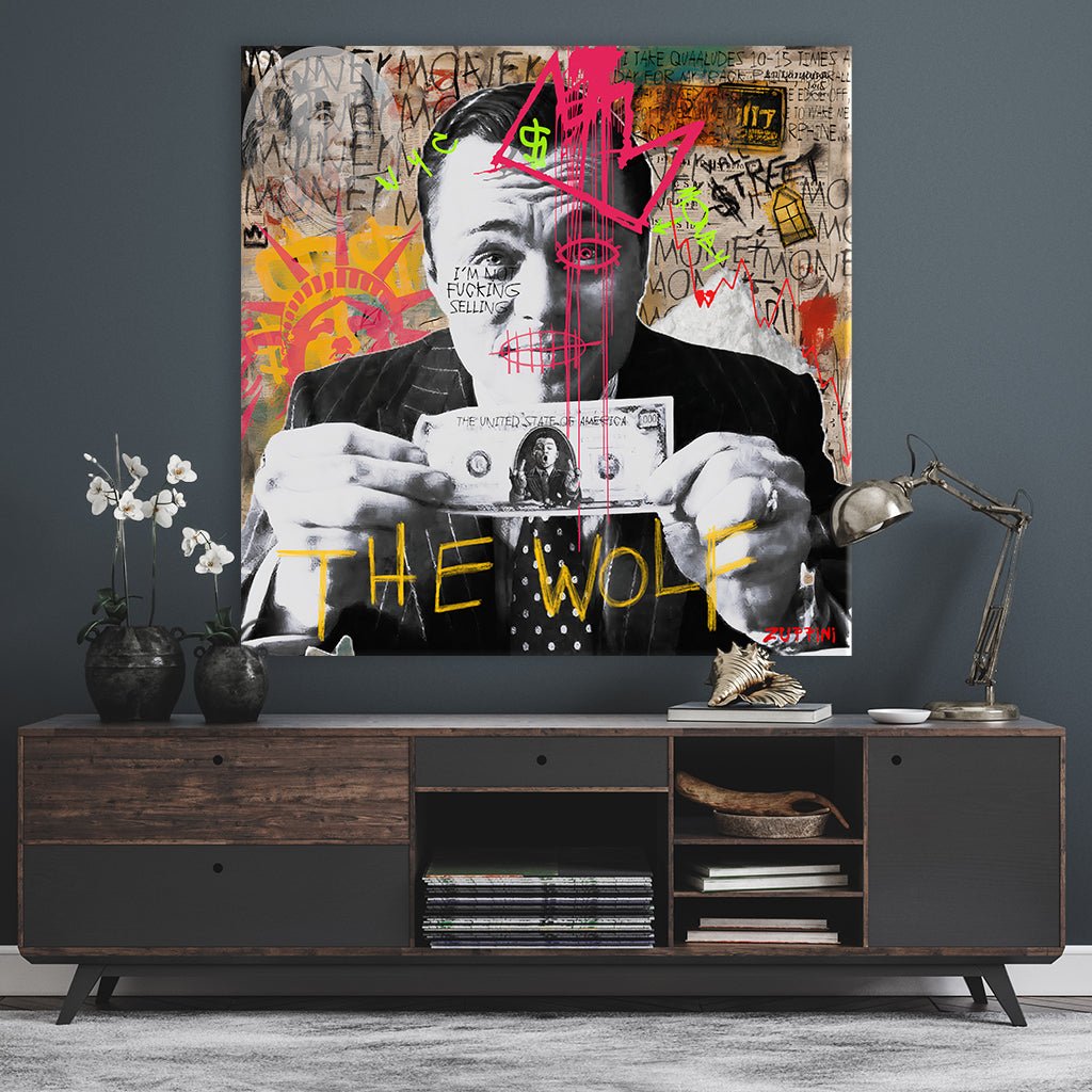 Ein schwarz-weißes Porträt von Leonardo DiCaprio als Jordan Belfort, der einen Dollar-Schein in den Händen hält und von leuchtend pinken und gelben Graffiti-Elementen, darunter eine Krone und ein Zitat: "I'M NOT FUCKING SELLING", überlagert ist. Der Hintergrund ist ein chaotisches Gemisch aus Schriftzügen wie "MONEY MONEY" und finanziellen Symbolen, die den Film "The Wolf of Wall Street" widerspiegeln.
