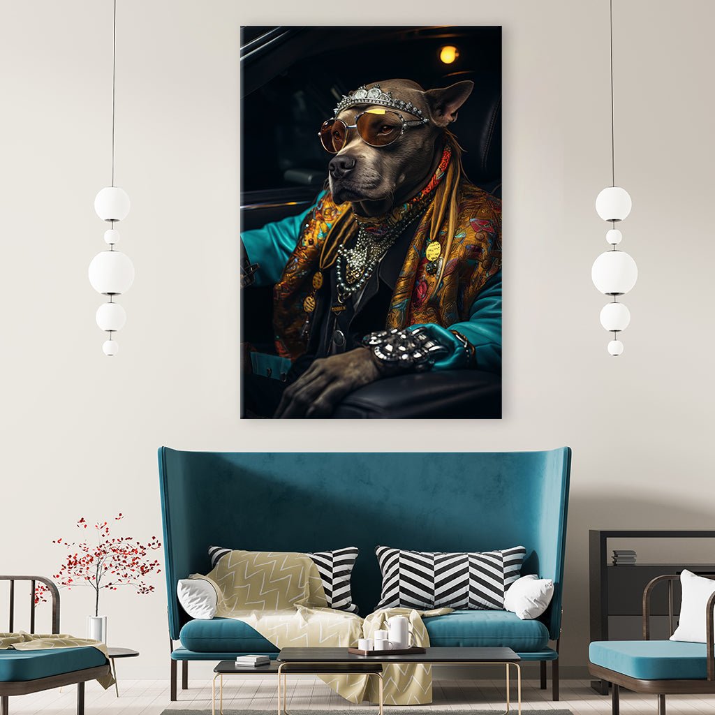 Eine Hündin rockt den Style eines hippen Rappers: Sonnenbrille, Diadem und coole Attitude. Dieses Motiv ist eine Fusion aus Adrenalin und Spaß, ein Mix aus Street-Vibes und lässiger Pose. Ein Bild, das die hippe Kultur zelebriert und dabei ein Schmunzeln auf das Gesicht zaubert.
