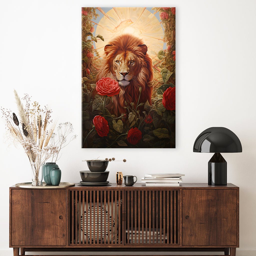Ein majestätischer Löwe in seiner schönsten Pracht, während rote Rosen im Vordergrund eine anmutige Ergänzung bieten. Hinter ihm erstrahlt eine große gelbe Sonne und taucht die Szene in ein warmes Licht. Dieses Bild vereint die kraftvolle Anmut des Löwen mit der zarten Schönheit der Blumen und der Energie der strahlenden Sonne und wirkt wie ein Gemälde.