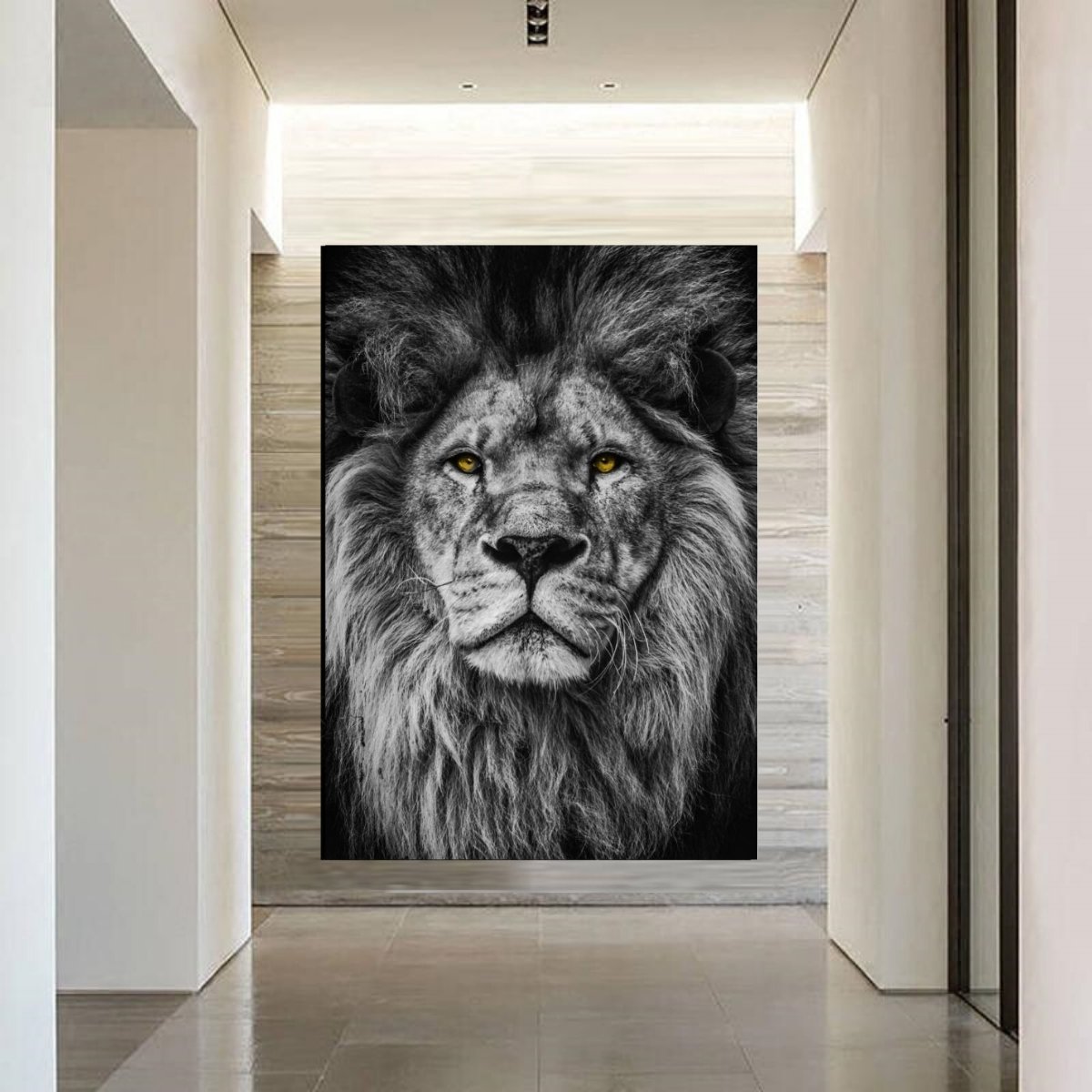 Der Löwe ist neben dem Tiger eine der beiden größten Arten aus der Familie der Katzen. Löwen sind die sozialsten unter den Katzen und leben als einzige in Gruppen. Der Löwe auf unserem Bild trägt eine prachtvolle Mähne und seine orangen Augen, die durch die schwarz weiße Gestalung, blicken auf dich herab und sind ein toller Blickfang.