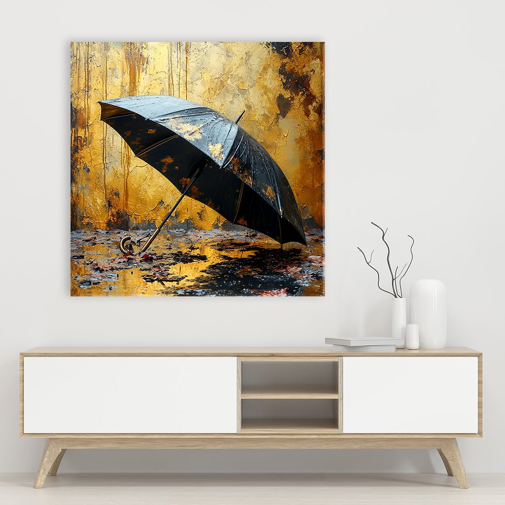 Das Bild zeigt einen vom Regen durchnässten schwarzen Regenschirm, der auf dem Boden liegt. Seine Oberfläche ist mit leuchtenden gelb-goldenen Flecken verziert, die im Kontrast zum dunklen Stoff des Schirms stehen. Im Hintergrund eine Wand in sattem Gelb-Gold, die das Motiv harmonisch umrahmt und dem Bild eine warme, aber zugleich melancholische Atmosphäre verleiht.