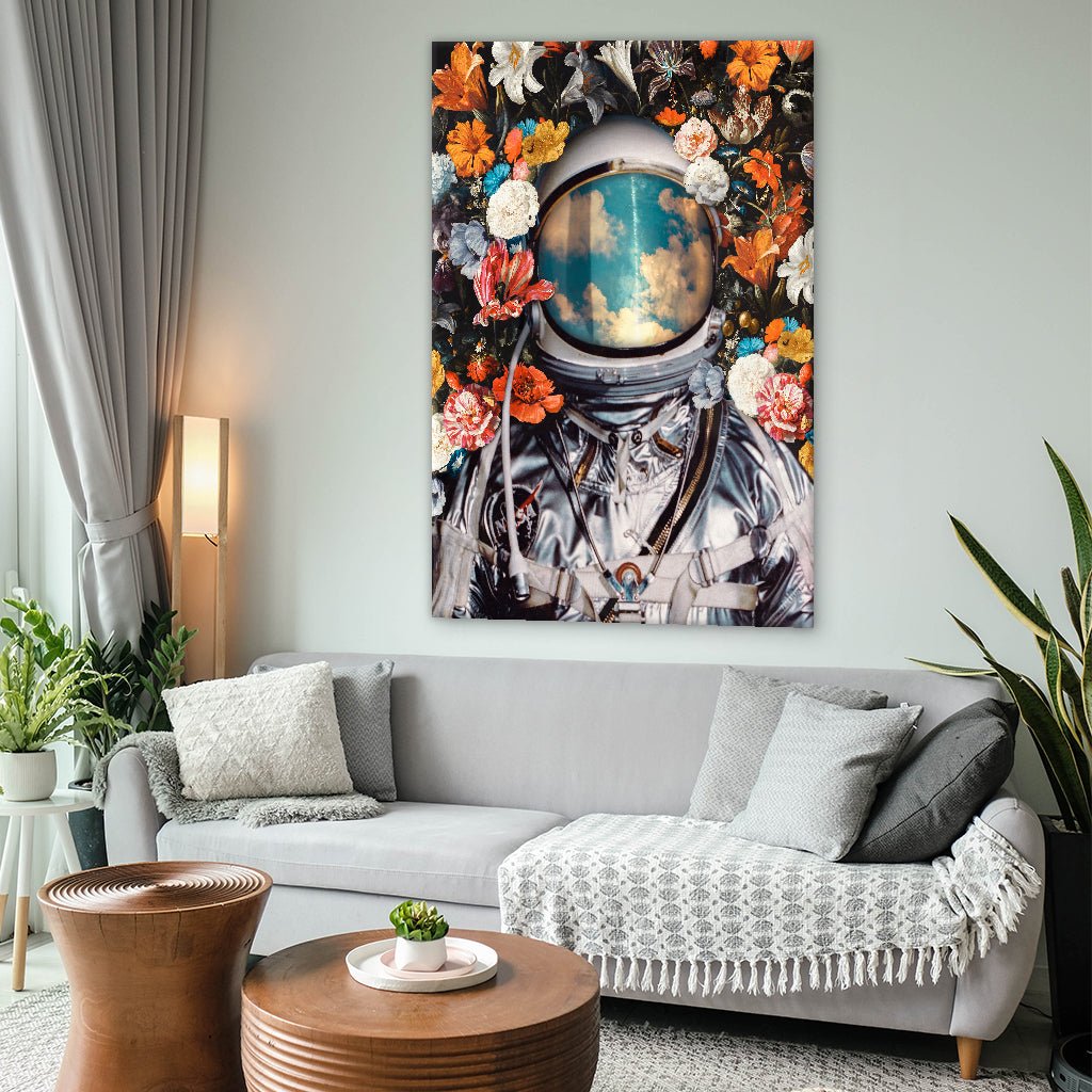 Ce motif surréaliste représente un astronaute allongé dans une mer de fleurs. Son casque reflète le ciel bleu et ses nuages blancs.
