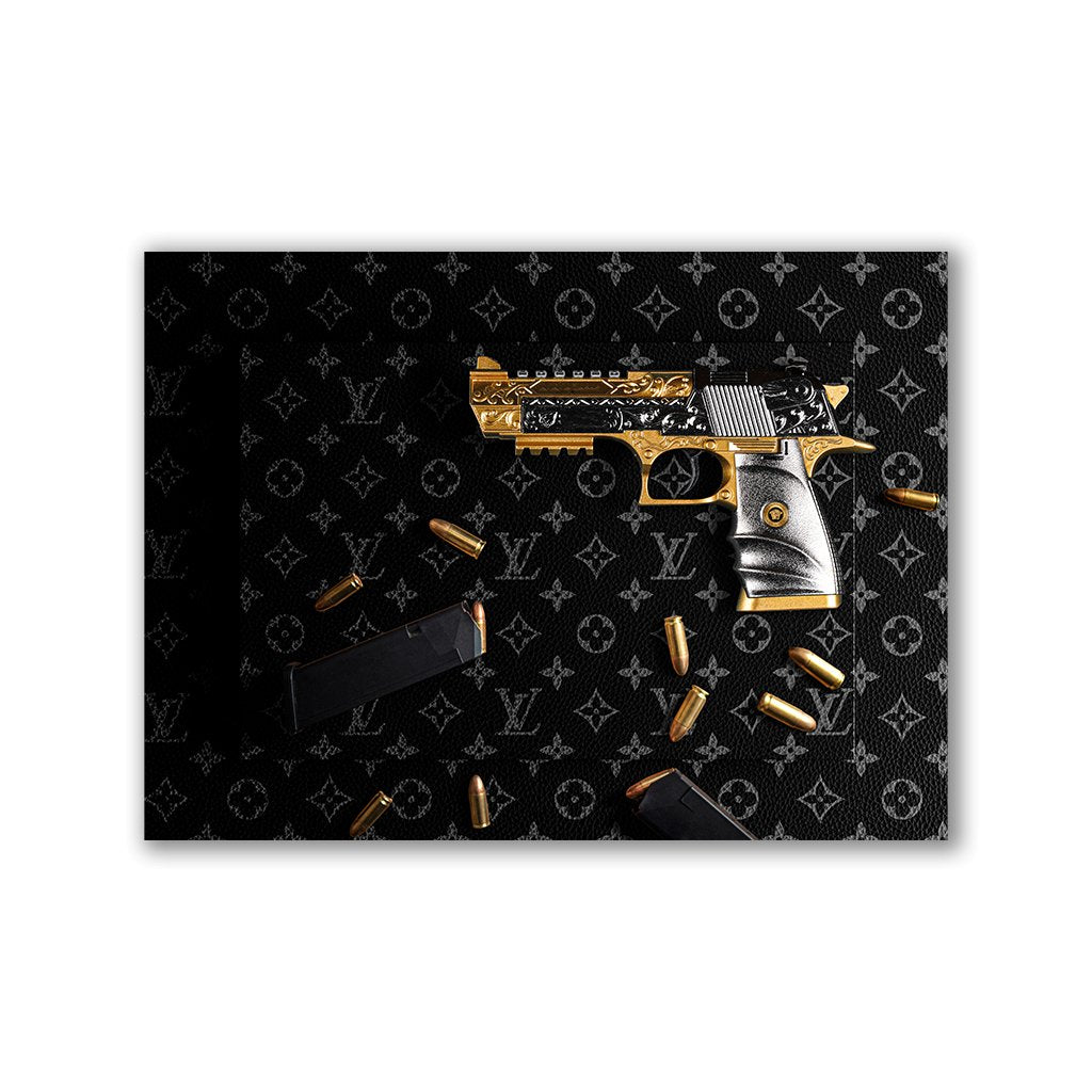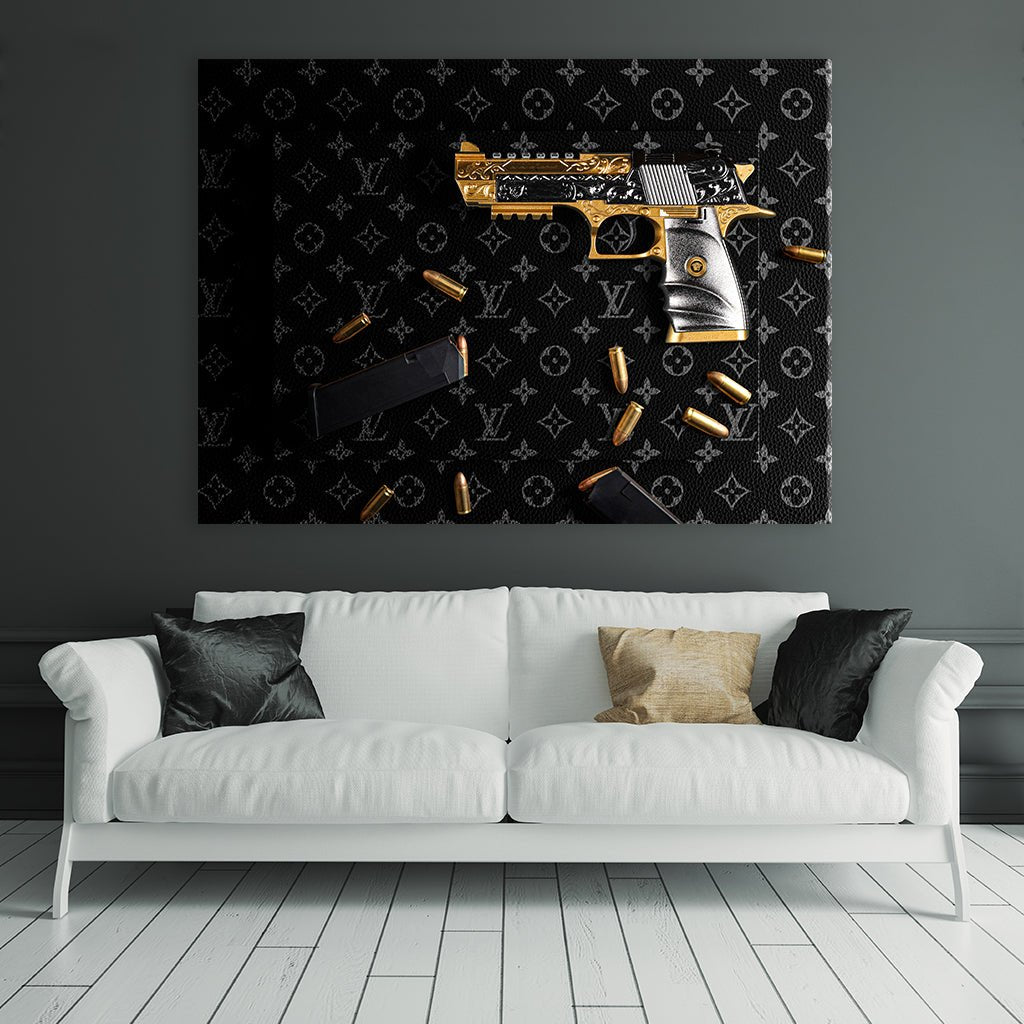 Ein eleganter Revolver in Schwarz und Gold ruht auf einem Hintergrund aus Leder mit Louis Vuitton Logos, umgeben von einzelnen Patronen. Dieses Bild vereint Luxus und Mystik in einem, während der Kontrast zwischen den edlen Goldakzenten und dem markanten Lederstil eine faszinierende visuelle Dynamik schafft.
