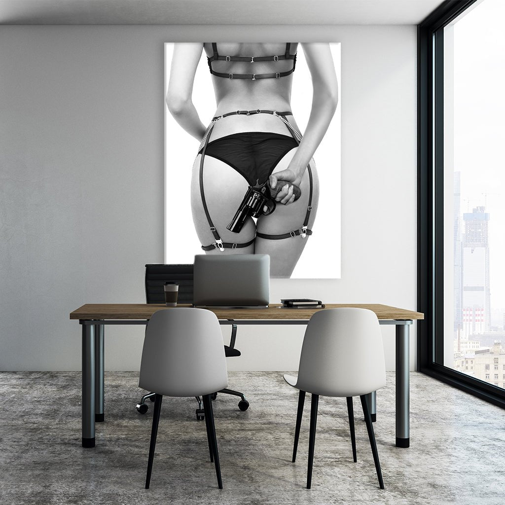 Wie wäre es mit unserer sexy Dame in heißen Strapsen und einer Waffe hinter dem Rücken? Sie ist auf jeden Fall ein Blickfang für deine Wände im Wohnzimmer, Flur oder Schlafzimmer.